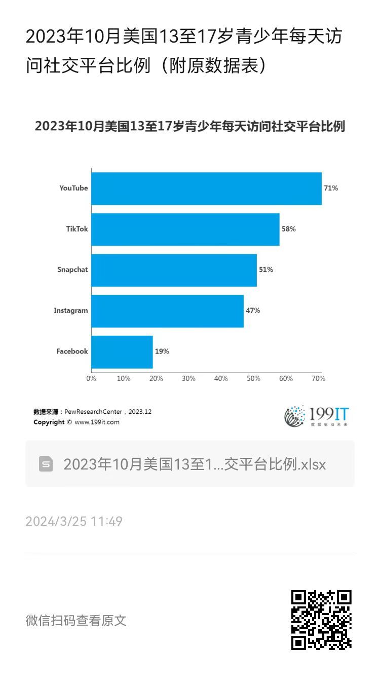 2023年10月美国13至17岁青少年每天访问社交平台比例(附原数据表) ​​​