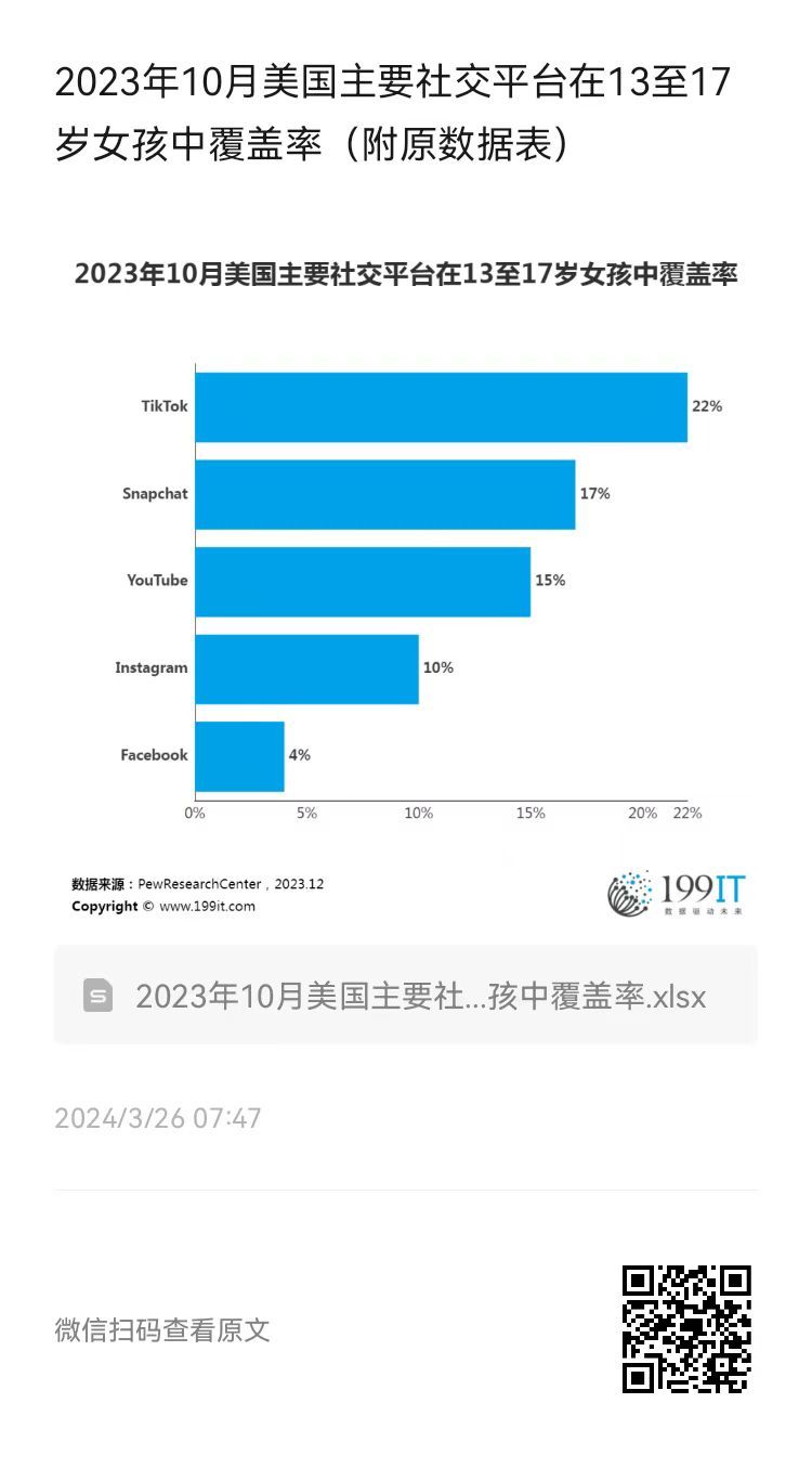 - 23年10月美国主要社交平台在13至17岁白人青少年中覆盖率(附原数据表)