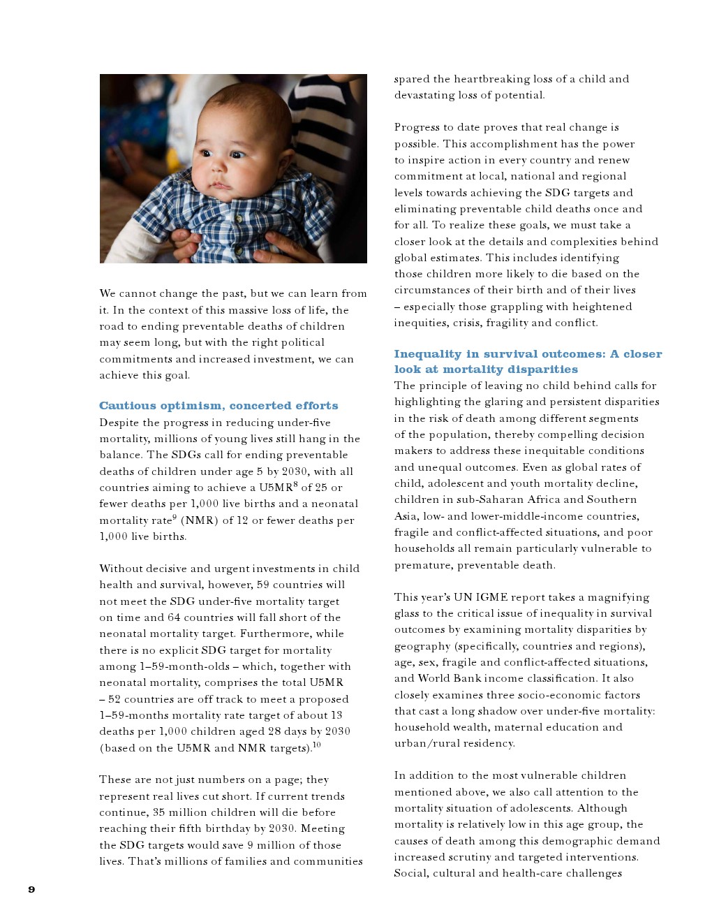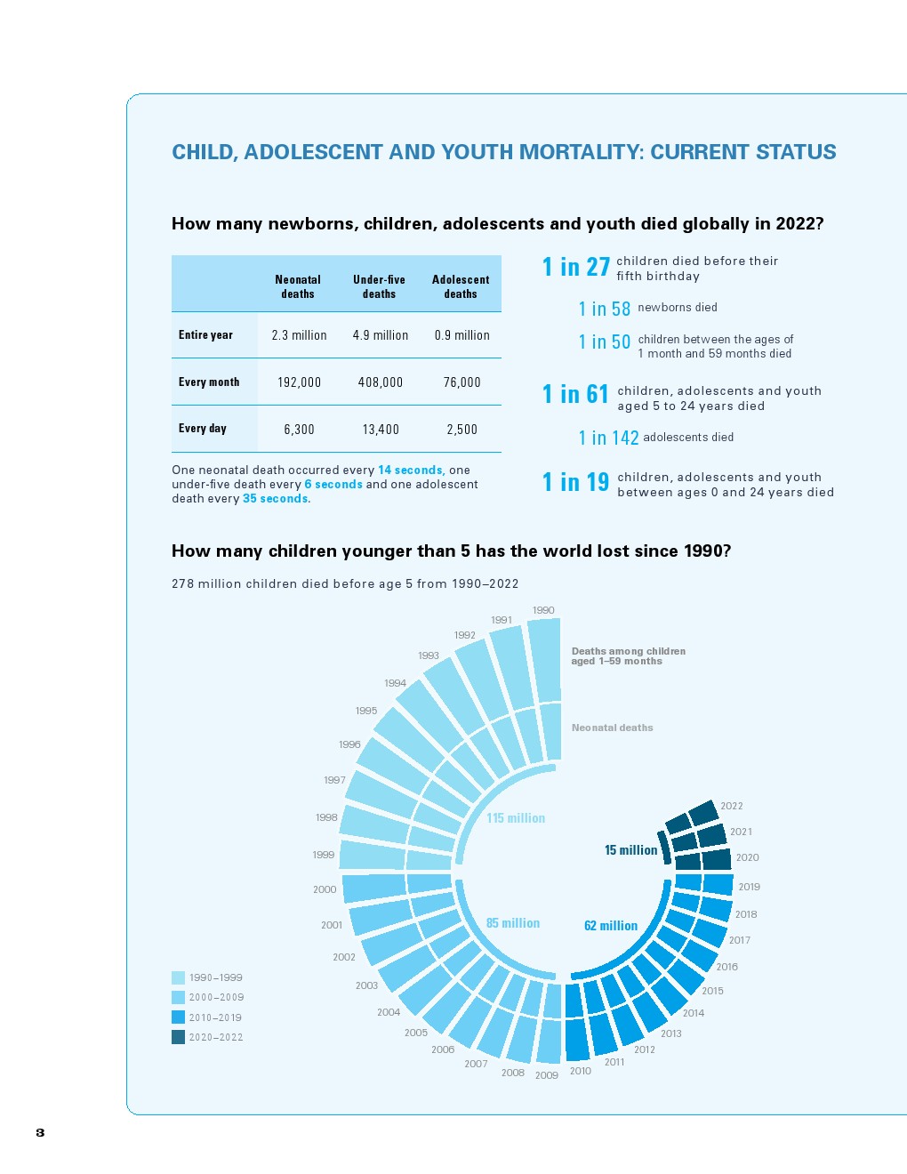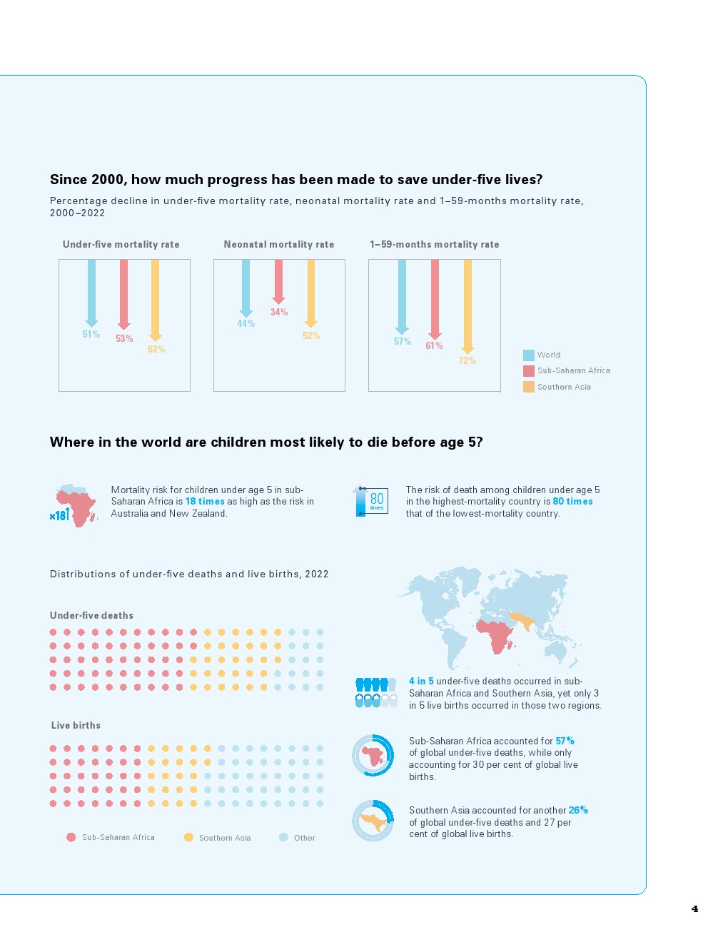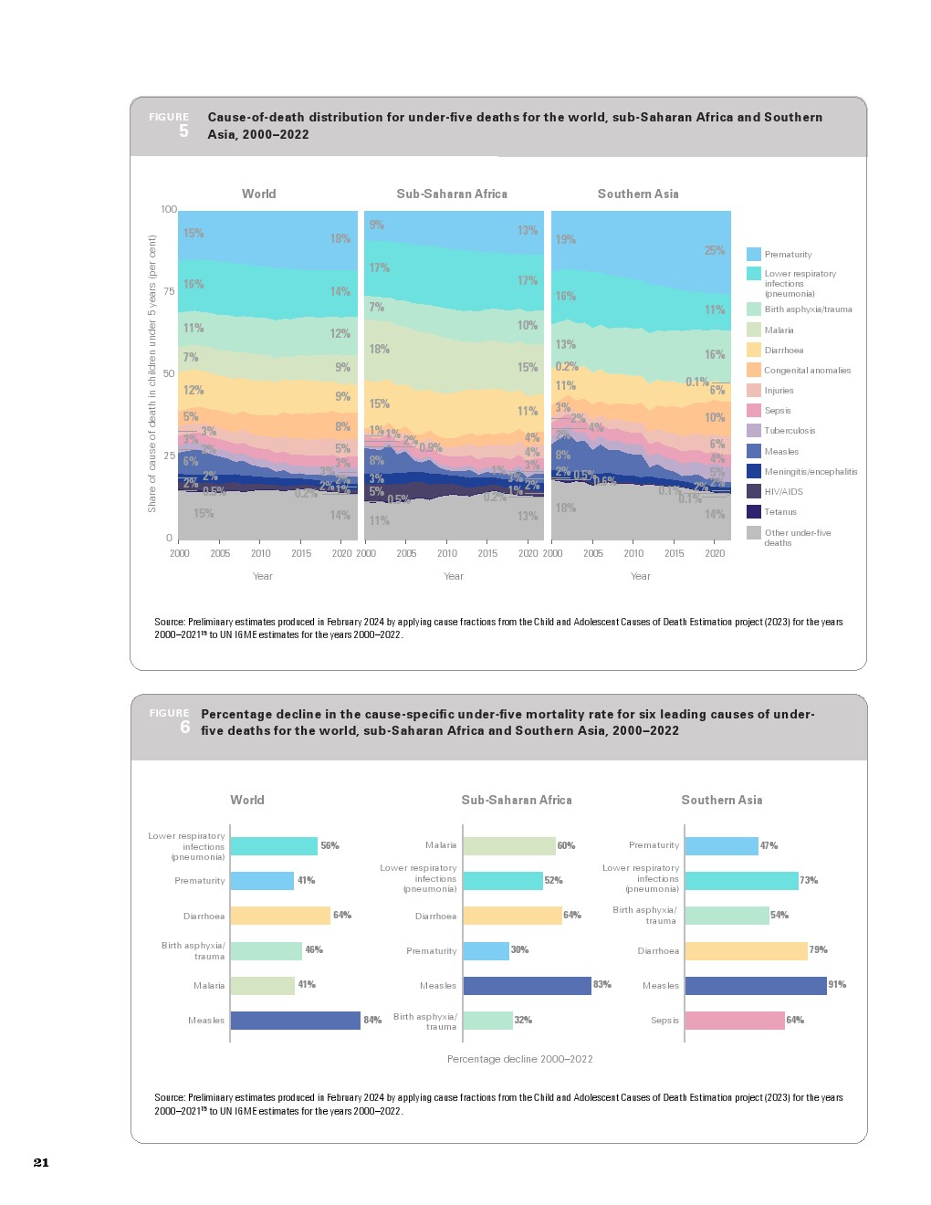 但是,调查结果发现,尽管取得了这一进展,但要结束所有可预防的儿童和青年死亡,还有很长的路要走。除了490万五岁以下儿童死亡(其中近一半为新生儿)之外,还有210万5-24岁儿童和青年早亡。这些死亡大多集中在撒哈拉以南非洲和南亚。