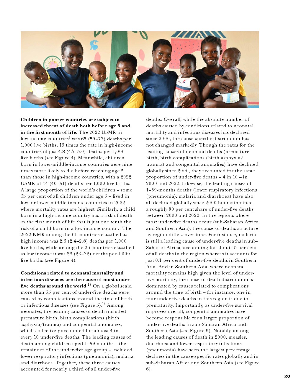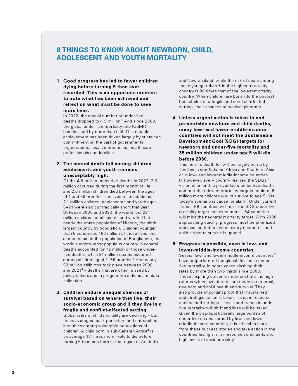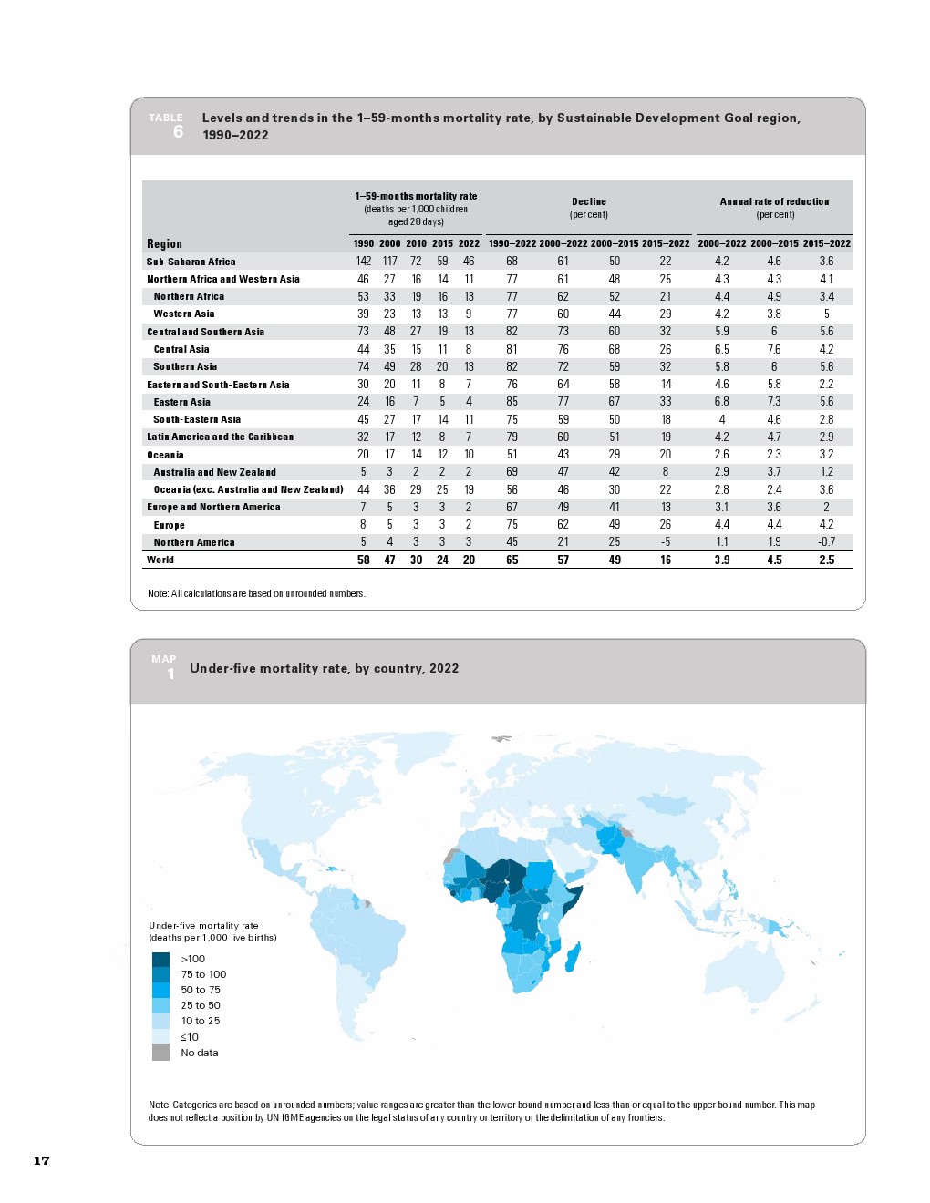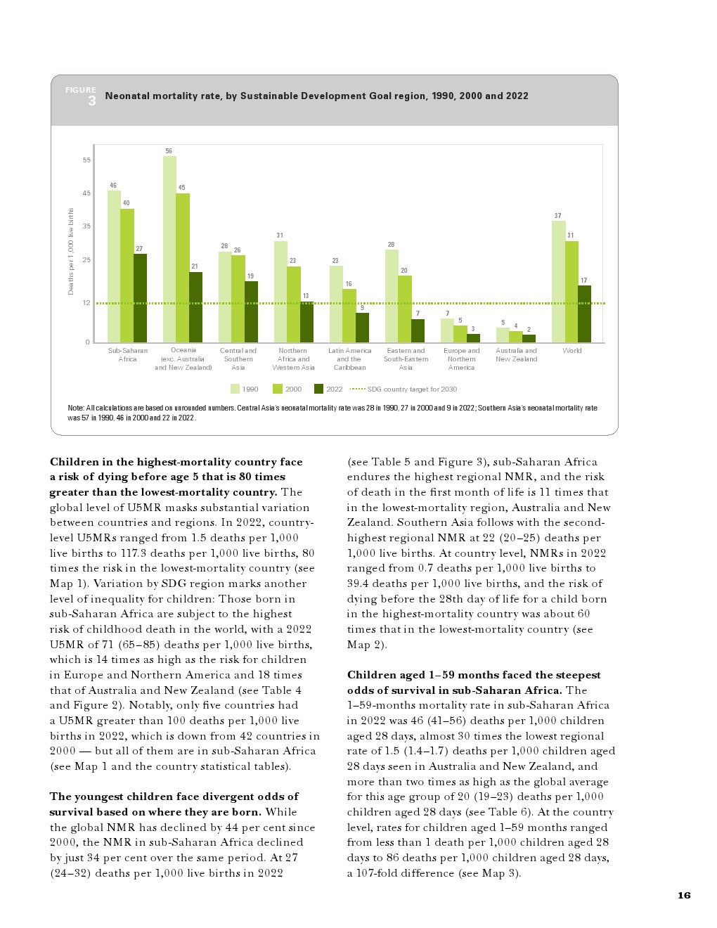 但是,调查结果发现,尽管取得了这一进展,但要结束所有可预防的儿童和青年死亡,还有很长的路要走。除了490万五岁以下儿童死亡(其中近一半为新生儿)之外,还有210万5-24岁儿童和青年早亡。这些死亡大多集中在撒哈拉以南非洲和南亚。