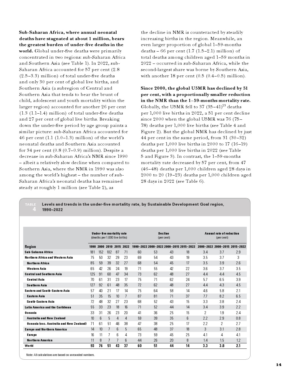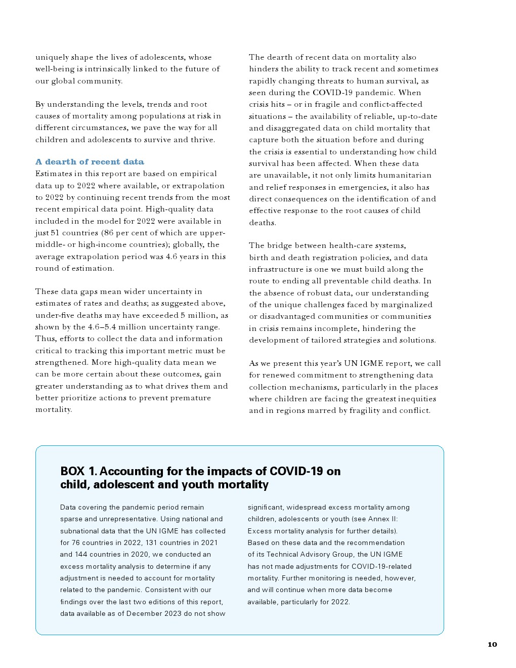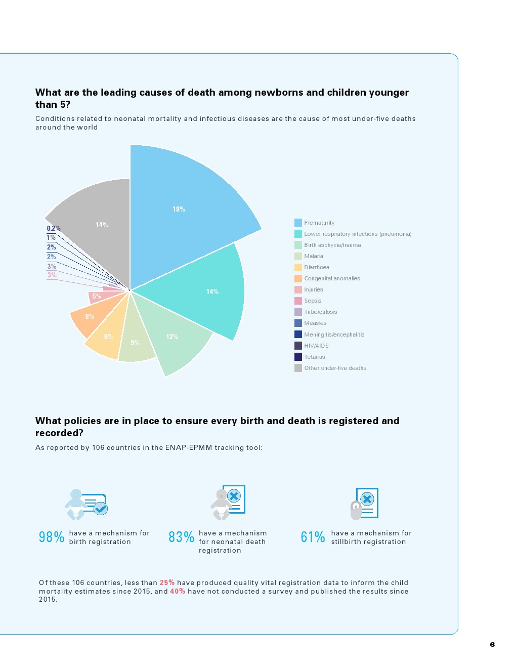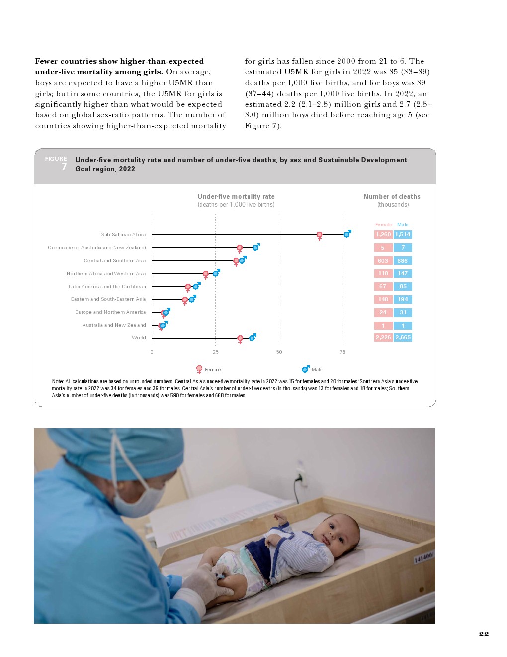 但是,调查结果发现,尽管取得了这一进展,但要结束所有可预防的儿童和青年死亡,还有很长的路要走。除了490万五岁以下儿童死亡(其中近一半为新生儿)之外,还有210万5-24岁儿童和青年早亡。这些死亡大多集中在撒哈拉以南非洲和南亚。