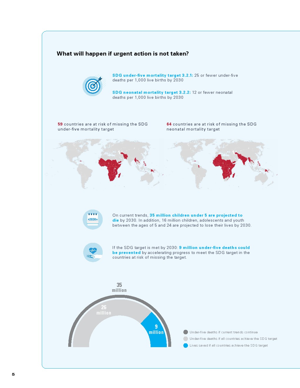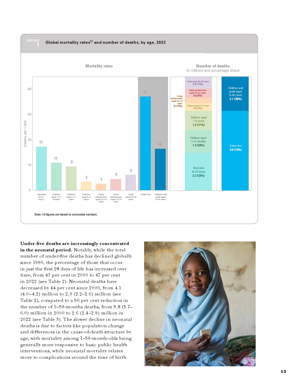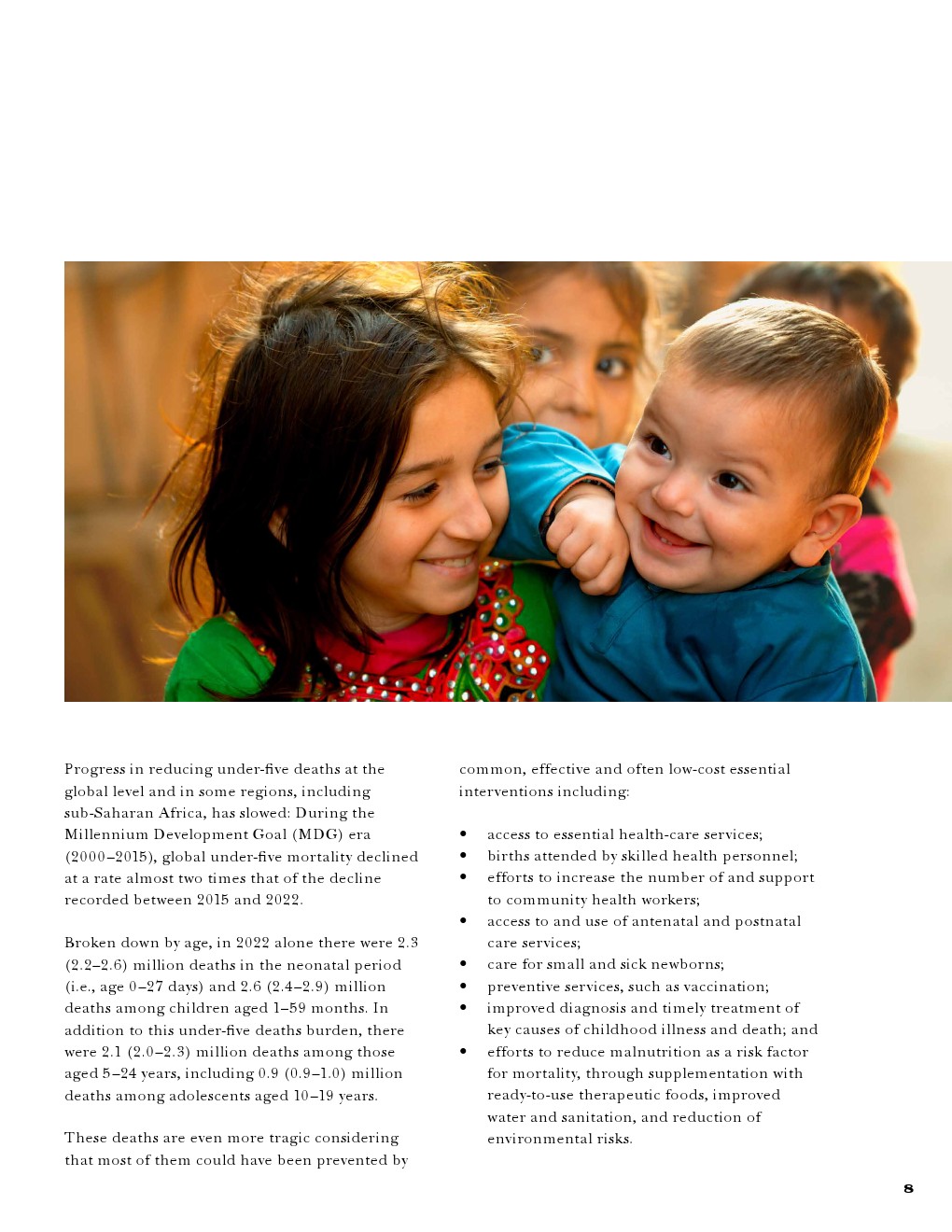 主要是由于早产、分娩并发症、肺炎、腹泻和疟疾等可预防或可治疗的原因造成的。如果能够更好地获得包括接种疫苗、熟练的卫生人员助产、早期和持续母乳喂养支持以及儿童疾病诊断和治疗等低成本的基本干预措施在内的高质量初级卫生保健,很多生命本可以得到挽救。