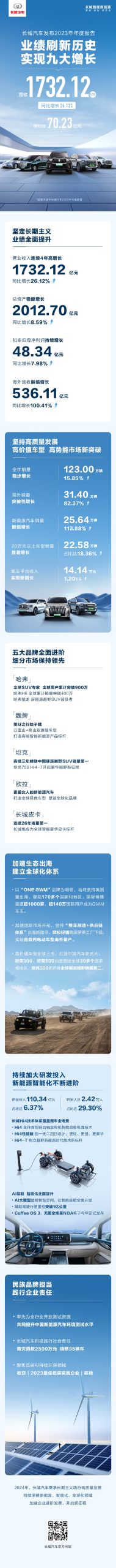 据媒体报道,长城汽车发布了2023年年度报告。据悉,2023年,长城汽车在2023全年营收1732亿元,同比增长26.12%,净利润达到70.23亿元。销量方面,全年累计销量达到了123万辆,同比增长15.85%,总资产达到2012.7亿元,同比增长8.59%。