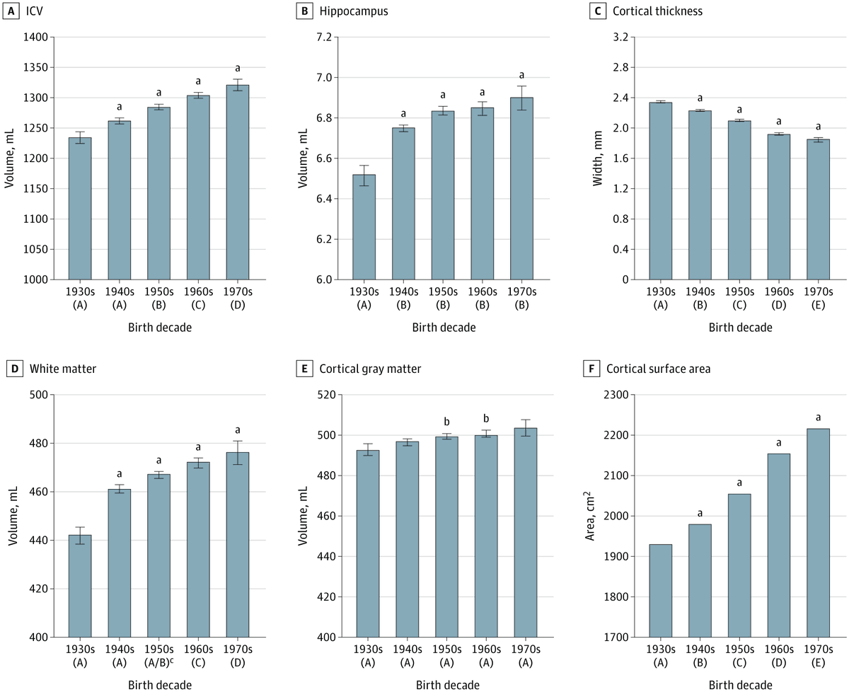 研究人员将 20 世纪 30 年代出生的人的核磁共振成像与 20 世纪 70 年代出生的人的核磁共振成像进行比较后发现,有几种大脑结构的大小在逐渐但持续地增加。其中,颅内容积(ICV)或颅骨(头盖骨)内的容积逐年增加,从 30 年代的平均 1,234 毫升/41.7 盎司增加到 70 年代的 1,321 毫升/44.7 盎司–增加了 6.6%。