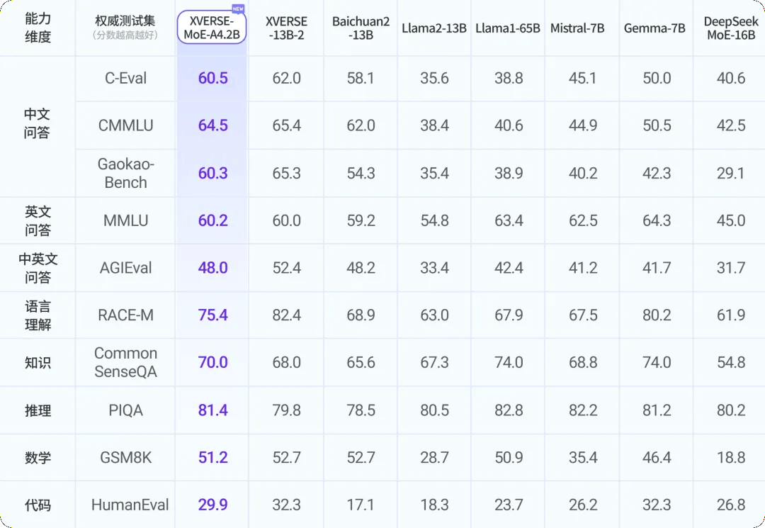 2. 超凡性能:在多个权威评测中,元象 MoE效果大幅超越 新晋业界顶流谷歌Gemma-7B和Mistral-7B、Meta开源标杆Llama2-13B等多个模型、 并接近超大模型 Llama1-65B。