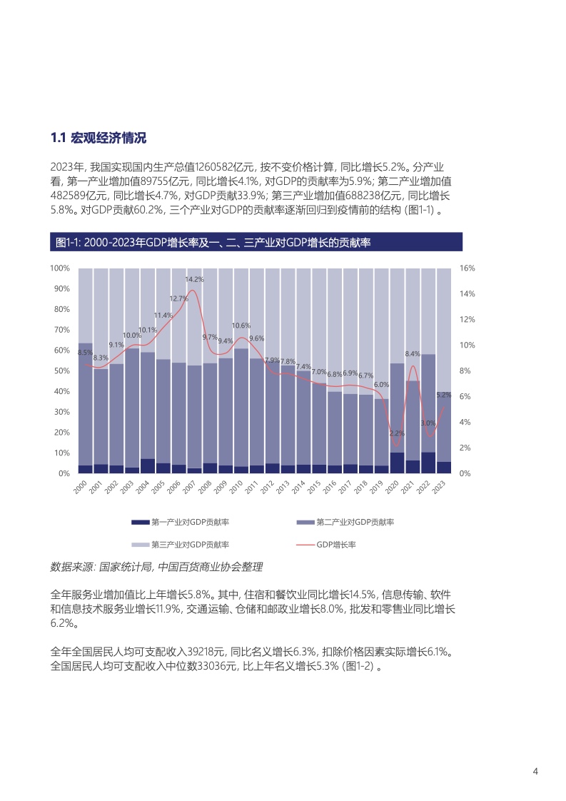 2023年,我国实现国内生产总值1260582亿元,按不变价格计算,同比增长5.2%。分产业 看,第一产业增加值89755亿元,同比增长4.1%,对GDP的贡献率为5.9%;第二产业增加值 482589亿元,同比增长4.7%,对GDP贡献33.9%;第三产业增加值688238亿元,同比增长 5.8%。对GDP贡献60.2%,三个产业对GDP的贡献率逐渐回归到疫情前的结构。