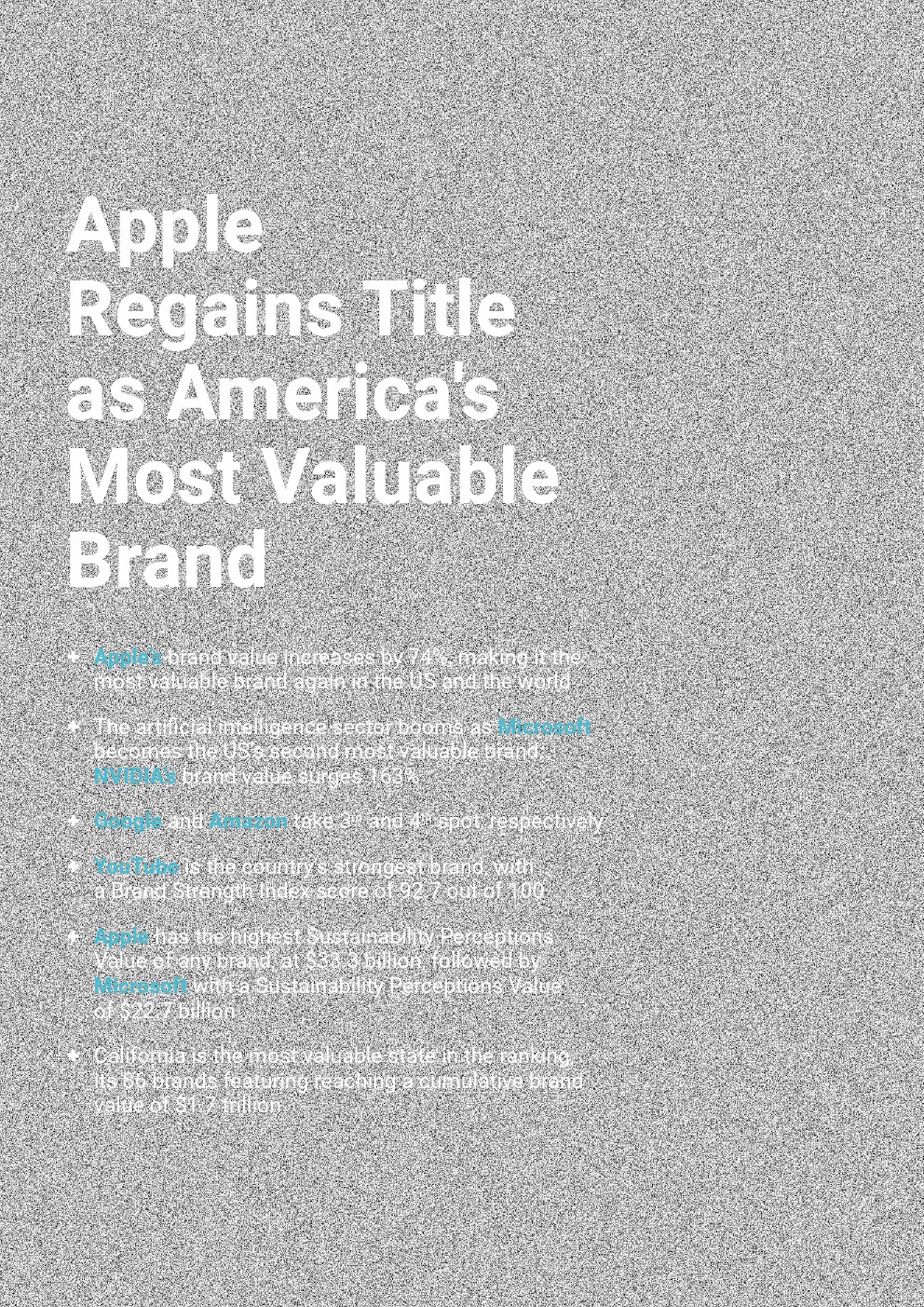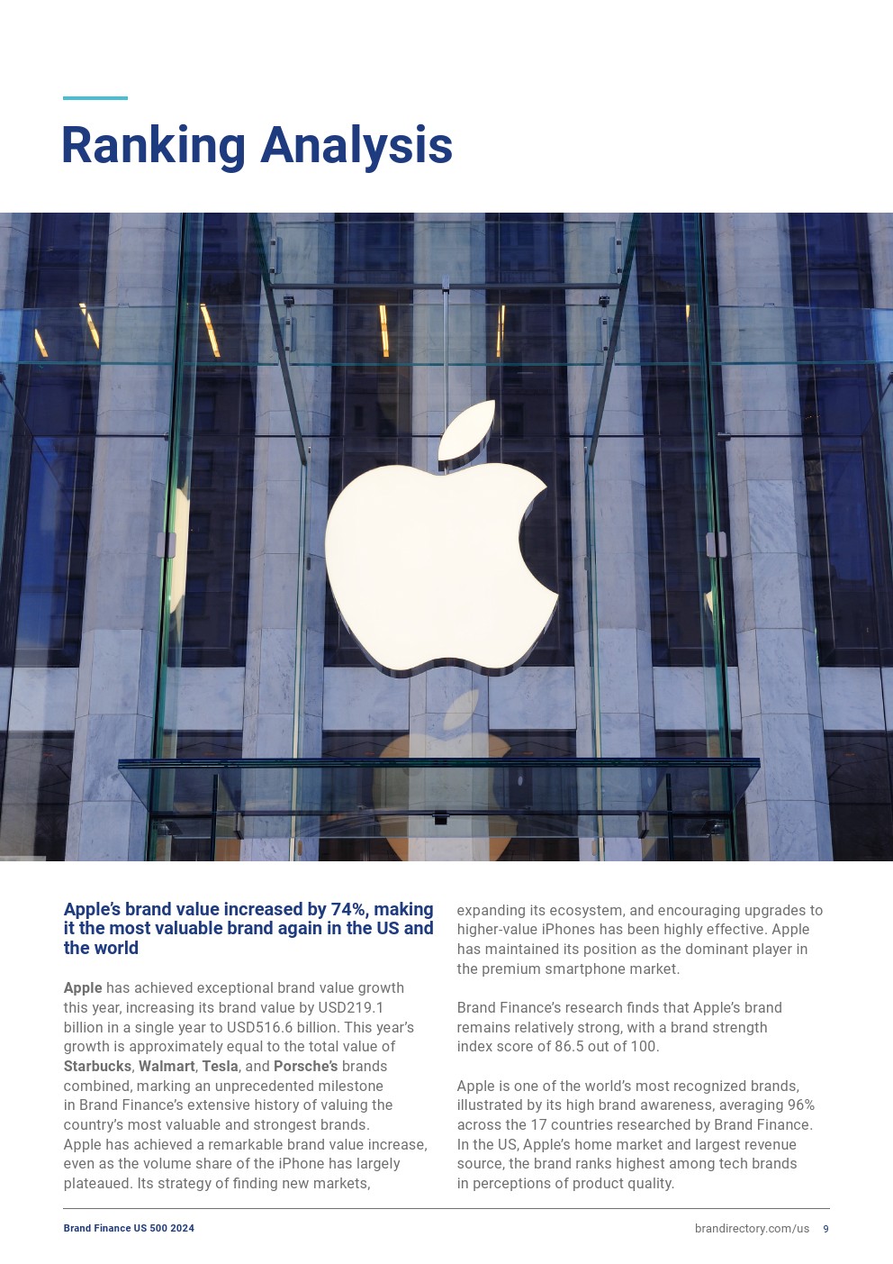 美国在科技领域的持续主导地位,体现在苹果(Apple)重新成为美国乃至全球最有价值品牌。苹果的品牌价值增长了2191亿美元(增长74%),达到5166亿美元。