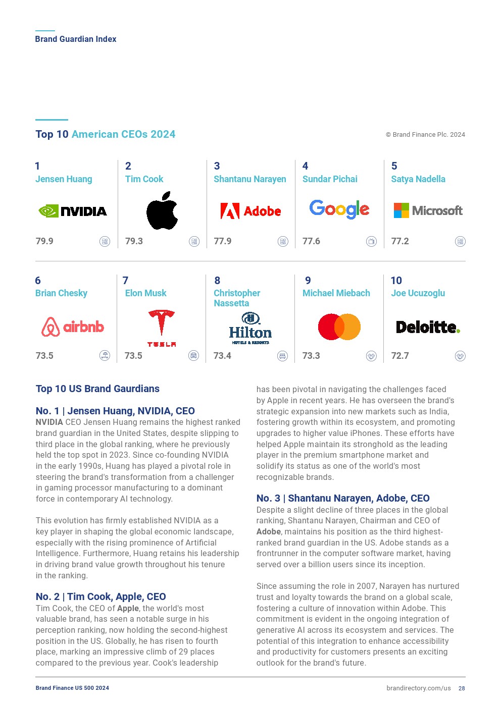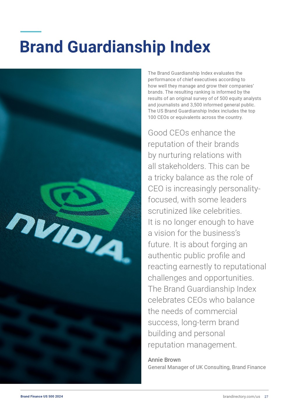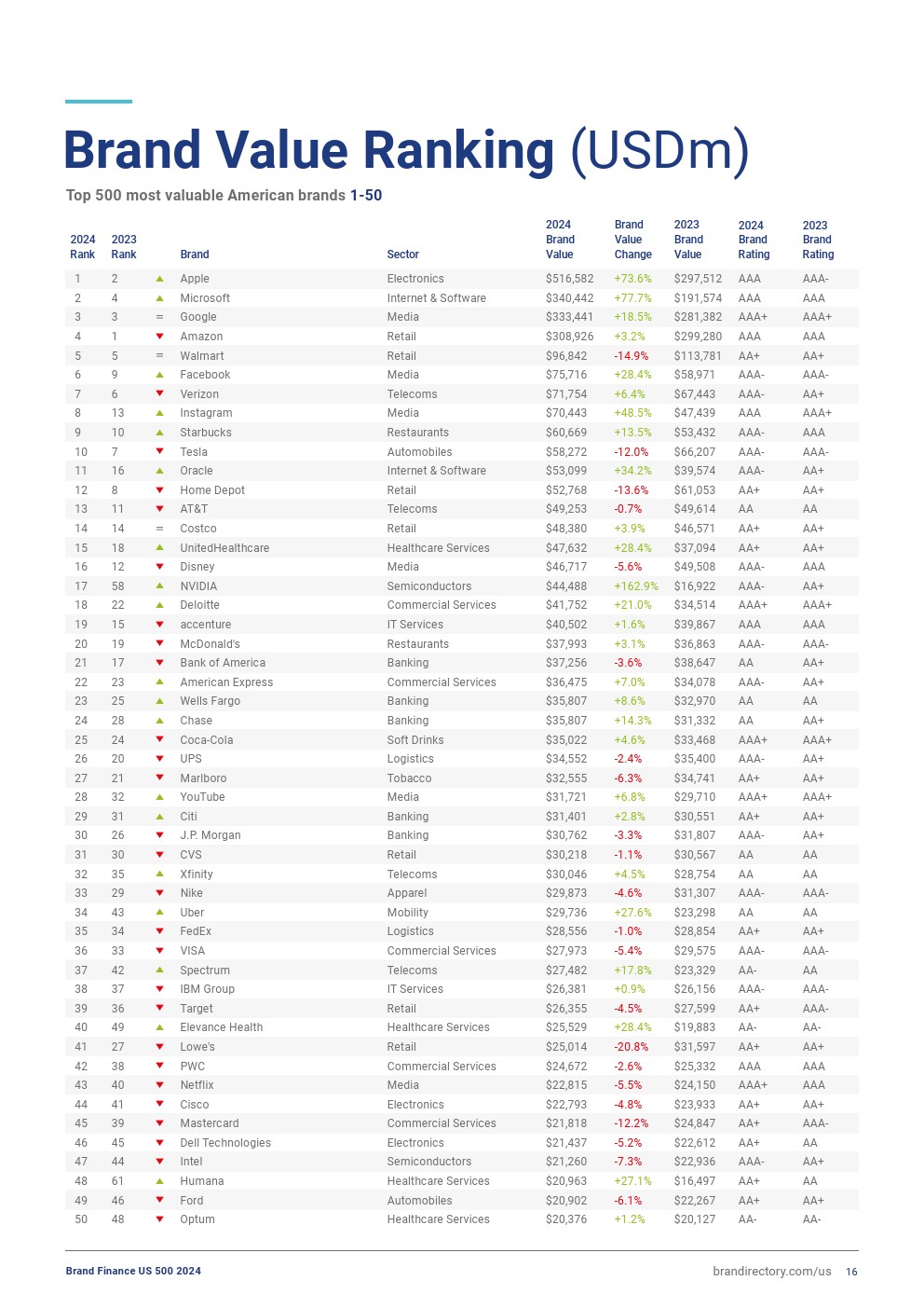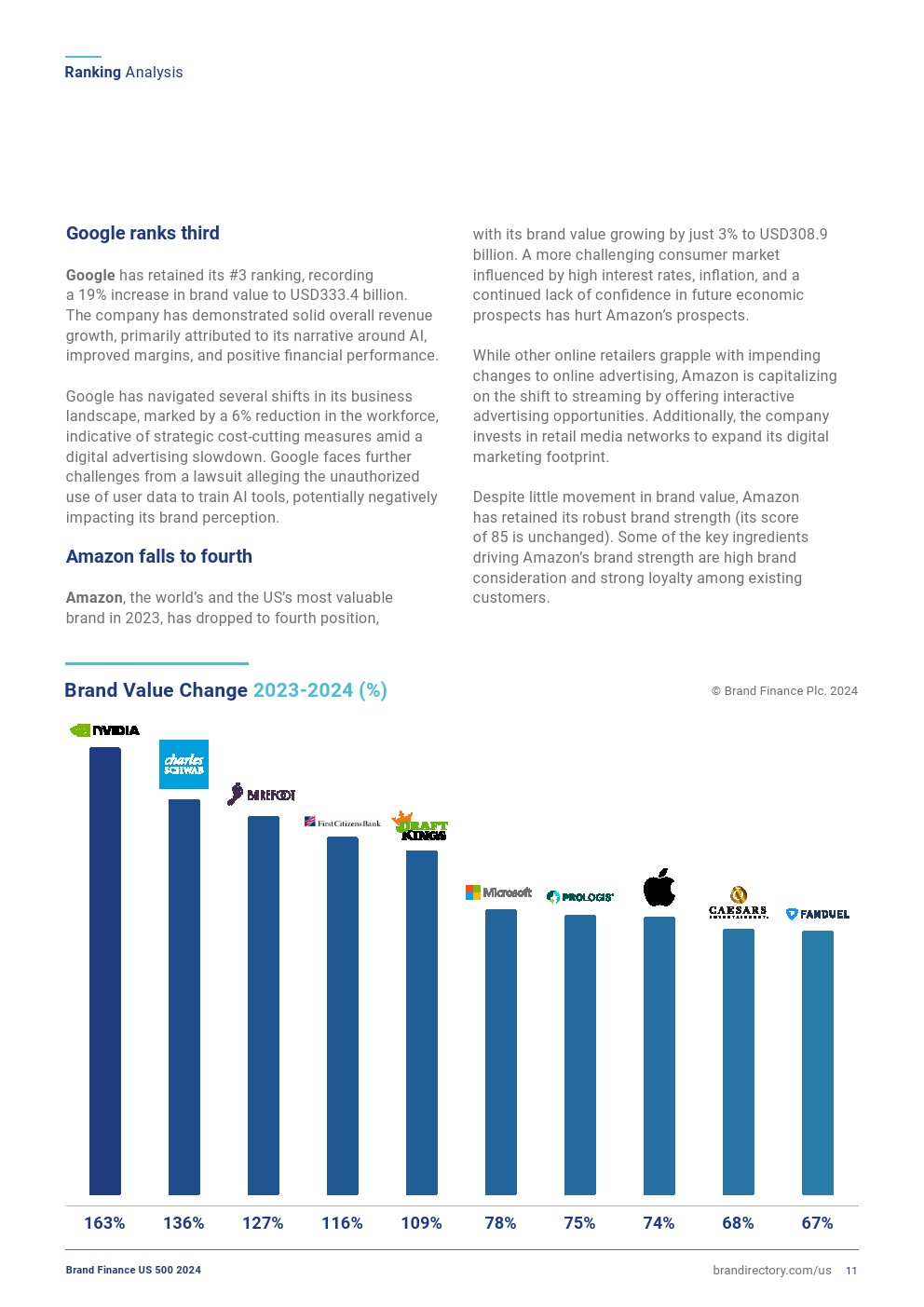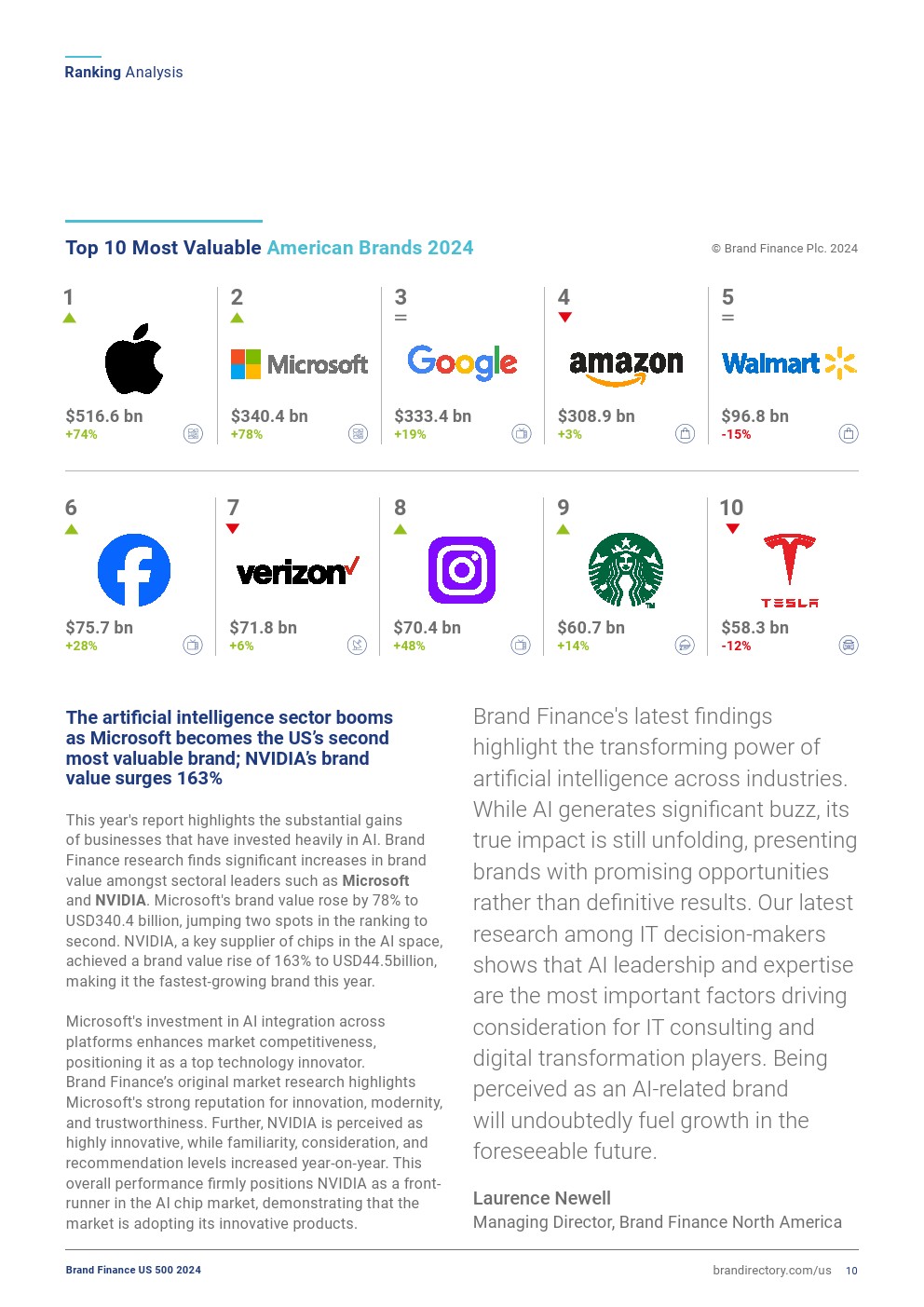 英伟达现在是美国增长最快的品牌,品牌价值增长了163%,达到445亿美元。在熟悉度、考虑度和推荐水平等关键品牌指标上,英伟达取得了显著进步,再次肯定了其作为人工智能领域领跑者的地位。微软(品牌价值增长78%,达到3404亿美元)是美国第二大品牌,因为该公司的人工智能战略将其定位为新兴技术应用和货币化的主要参与者。另一家GPU制造商AMD的品牌价值也增长了27%,达到88亿美元,这得益于其出色的财务业绩以及在人工智能和高性能计算方面的战略举措。