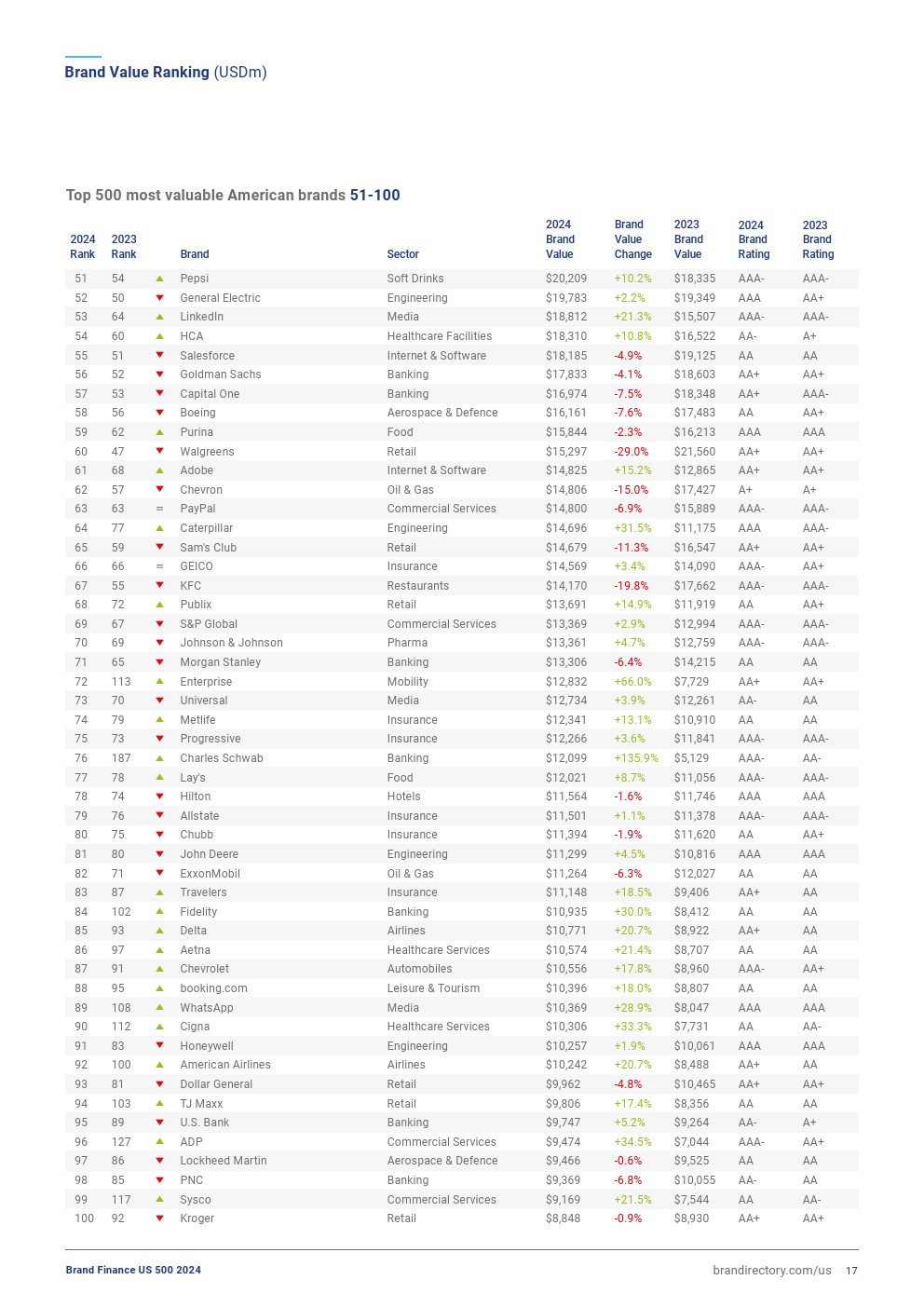 人工智能对品牌价值的影响超出了科技行业,在500强排名中,人工智能推动了各个行业的品牌价值增长。强生公司(品牌价值增长5%至134亿美元)将AI用于药物研发。像联合银行(品牌价值增长31%,达到28亿美元)这样的金融机构已经将AI聊天机器人纳入其移动平台,以提供个性化的客户帮助,而像美国运通(品牌价值增长7%,达到365亿美元)和彭博社(品牌价值增长22%,达到71亿美元)这样的公司已经实施了AI程序,以简化内部流程并改善决策。