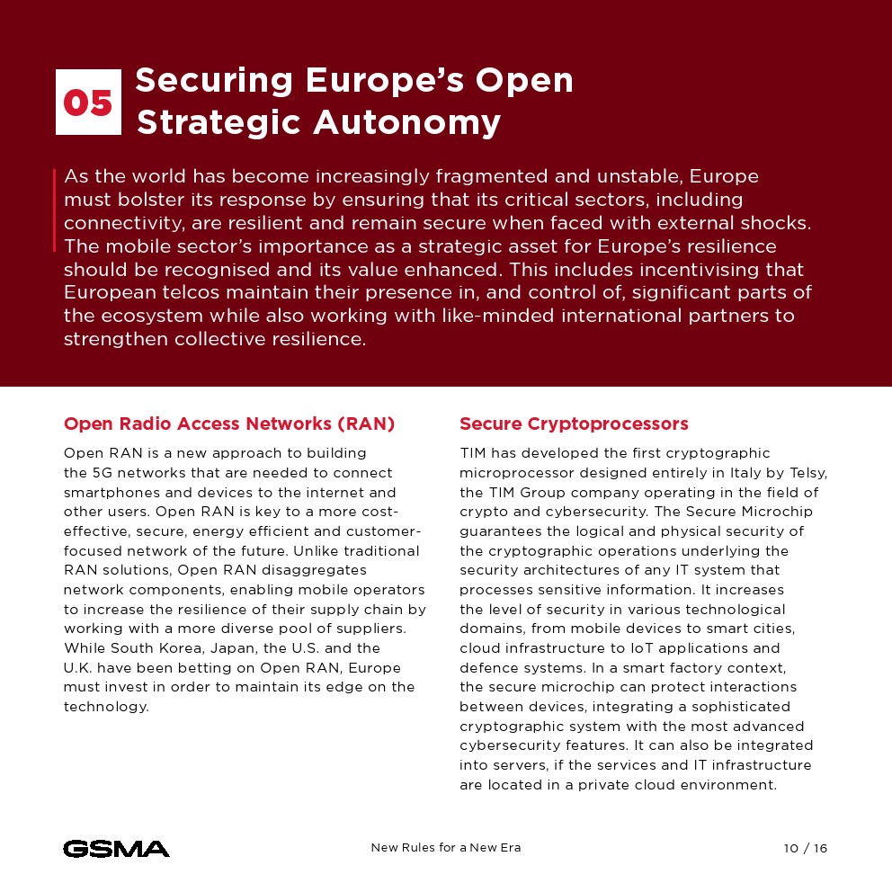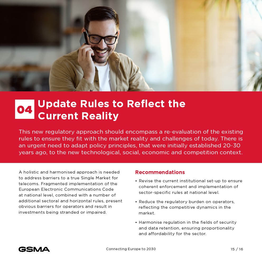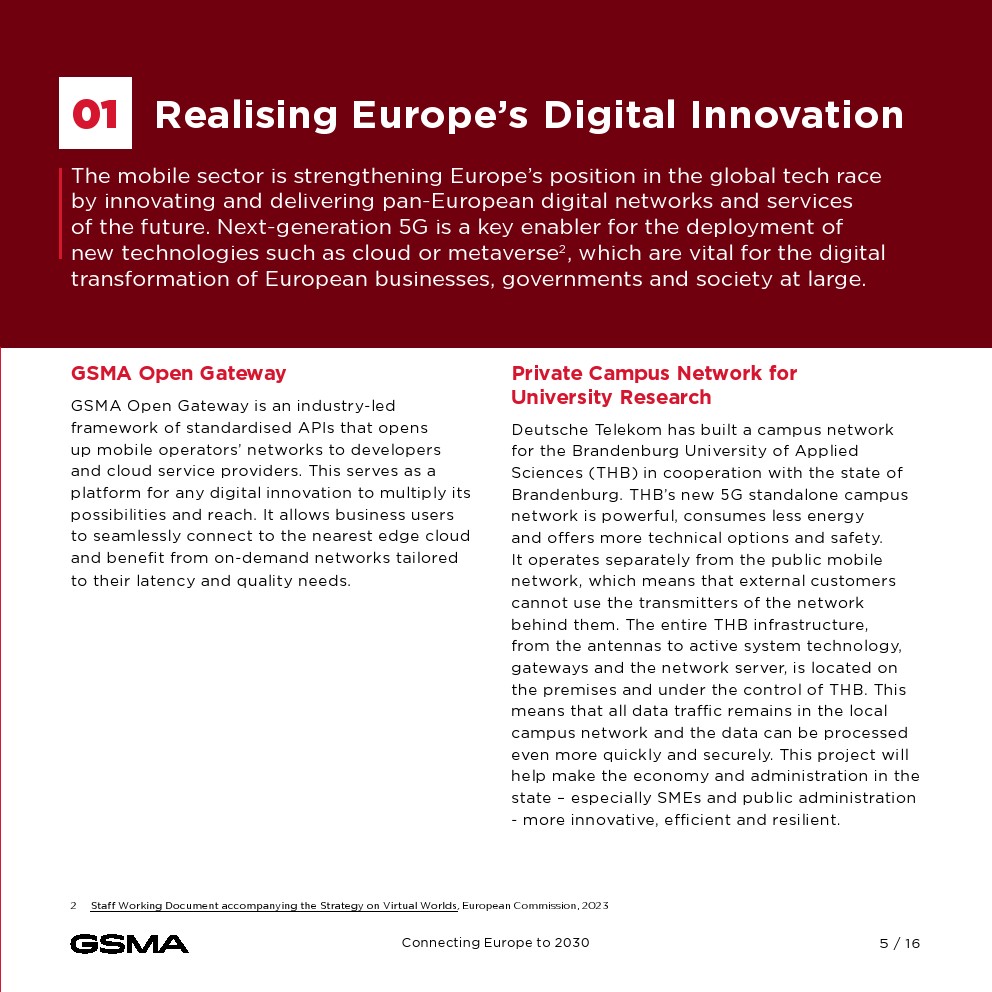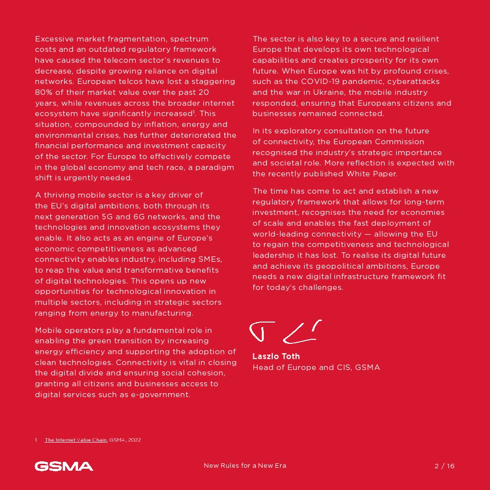 欧洲发现自己正处于一个关键时刻,面临着日益激烈的全球竞争、不断上升的贸易壁垒和对技术优势的争夺。该宣言强调了移动行业在推进欧盟数字议程方面的关键作用,因为欧洲大陆的目标是到2030年实现5G的普遍覆盖。实现这一愿景需要解决系统性挑战,包括市场分裂、监管障碍和投资壁垒,这些都抑制了欧洲电信行业的增长和竞争力。