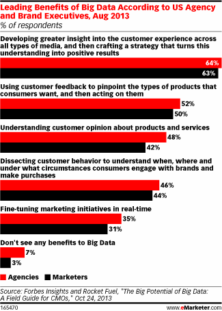 在美国,85%的代理公司和品牌主管认为,当对消费者行为进行深入分析时,大数据会带来超过一半的营销主动权。当看到使用大数据带来的好处时,越来越多的销售、签约和注册、ROI、客户满意度和销售机会同样也获得了类似的效果提升。