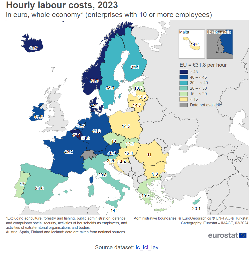 2023年,整个经济体的平均小时劳动力成本估计在欧盟为31.8欧元,在欧元区为35.6欧元,高于2022年的30.2欧元和34欧元。