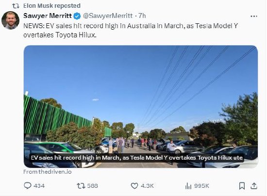 特斯拉CEO马斯克在X平台上转发了电动汽车分析师索耶·梅瑞特的一条帖子:今年3月,澳大利亚电动汽车销量创下历史新高,特斯拉Model Y再次成为最畅销电动车型。梅瑞特分享了澳大利亚电动汽车网站The Driven的一篇报道,以下是该报道的具体内容: