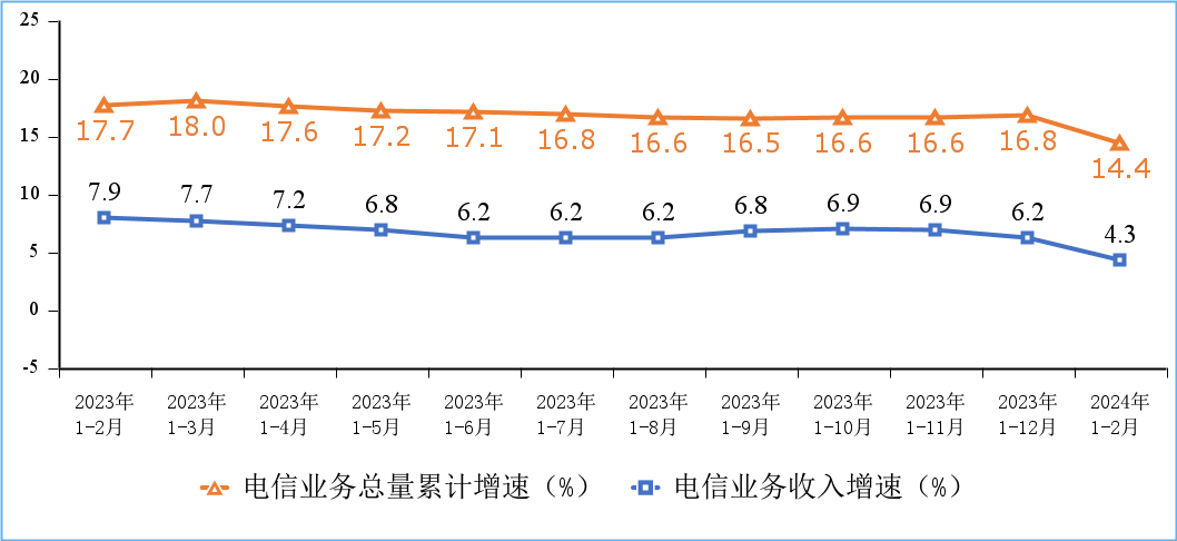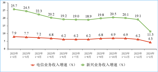 电信业务量收平稳增长。1-2 月份,电信业务收入累计完成 2923 亿元,同比增长 4.3%。按照上年不变价计算的电信业务总量同比增长 14.4%。