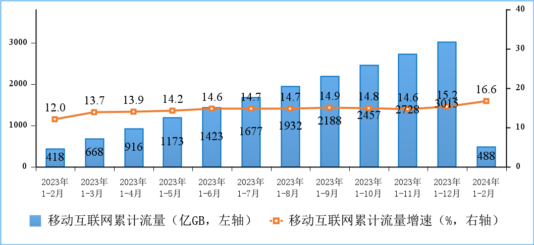 1. 自 2024 年 2 月起,将中国广播电视网络集团有限公司(简称中国广电)的 5G 移动电话用户数、5G 移动互联网接入流量、5G 移动互联网用户数纳入行业汇总数据,上年同期数据进行同步调整。
