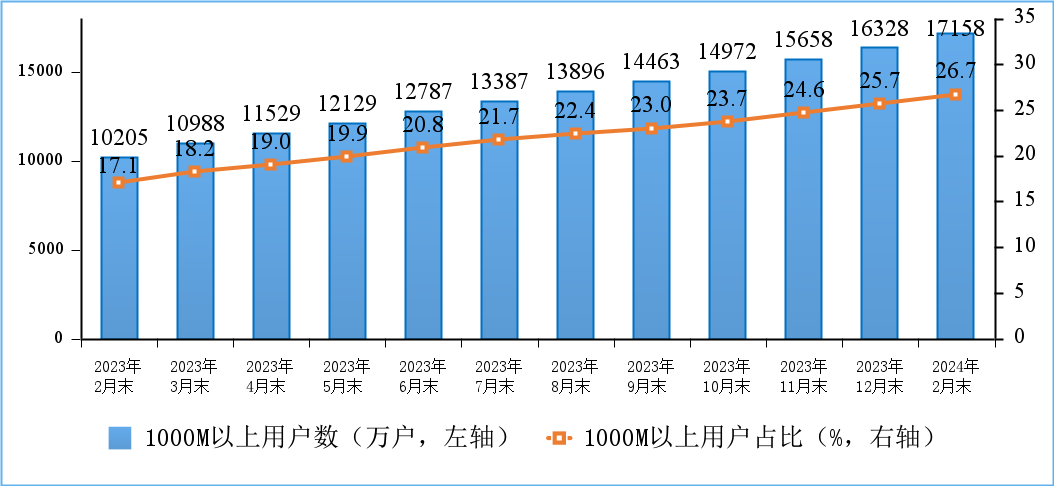 千兆用户规模持续扩大。截至 2 月末,三家基础电信企业的固定互联网宽带接入用户总数达 6.43 亿户,比上年末净增 677.4 万户。其中,100Mbps 及以上接入速率的固定互联网宽带接入用户达 6.08 亿户,占总用户数的 94.5%;1000Mbps 及以上接入速率的固定互联网宽带接入用户达 1.72 亿户,比上年末净增 830.1 万户,占总用户数的 26.7%,占比较上年末提升 1 个百分点。