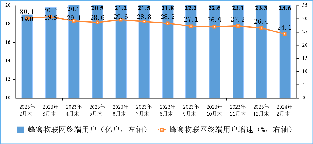 蜂窝物联网用户较快增长,IPTV(网络电视)用户稳步增加。截至 2 月末,三家基础电信企业发展蜂窝物联网终端用户 23.64 亿户,比上年末净增 3199 万户,占移动网终端连接数(包括移动电话用户和蜂窝物联网终端用户)的比重达 57.5%。IPTV(网络电视)总用户数达 4.05 亿户,比上年末净增 424.6 万户。