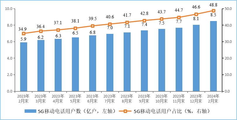 5G 用户占比近五成。截至 2 月末,三家基础电信企业及中国广电的移动电话用户总数【注 1】达 17.46 亿户,比上年末净增 240.9 万户。其中,5G 移动电话用户达 8.51 亿户,比上年末净增 2922 万户;占移动电话用户的 48.8%,占比较上年末提高 2.2 个百分点。