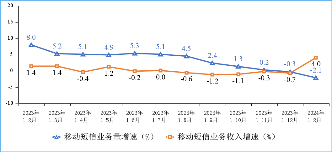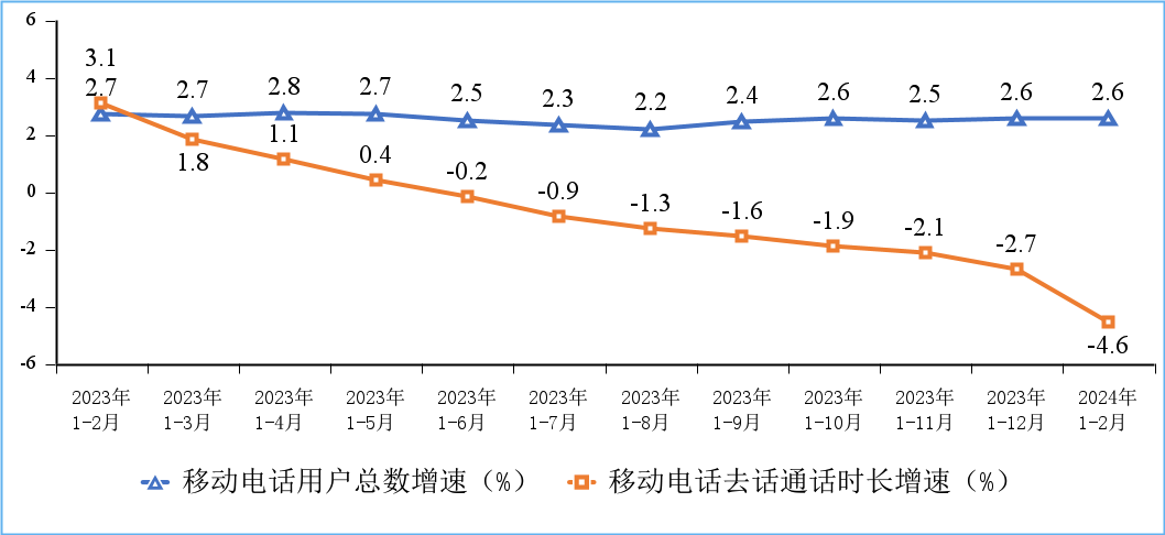 移动电话通话量小幅回落,移动短信业务收入增速转正。1-2 月份,移动电话去话通话时长完成 3420 亿分钟,同比下降 4.6%;固定电话主叫通话时长完成 110.1 亿分钟,同比下降 3.7%。1-2 月份,全国移动短信业务量同比下降 2.1%;移动短信业务收入同比增长 4%。