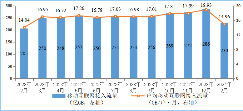 移动互联网流量增速保持较高水平,2 月 DOU 值达 15GB / 户。1-2 月份,移动互联网累计流量【见注 1】达 487.6 亿 GB,同比增长 16.6%,增速同比提升 4.6 个百分点。截至 2 月末,移动互联网用户数【见注 1】达 15.22 亿户,比上年末净增 250.8 万户。2 月当月户均移动互联网接入流量(DOU)达到 14.96GB / 户 · 月,同比增长 6.6%,比上年同期提升 0.92GB / 户 · 月。