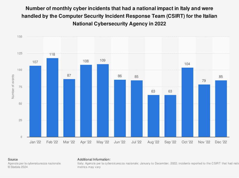 2019冠状病毒病大流行后,意大利企业面临的网络风险持续增加。2022年5月,意大利政府推出了该国首个国家网络安全战略,以更好地应对工业和机构数字化带来的挑战。2022年,由国家委托计算机安全事件响应小组(CSIRT)处理的影响全国的网络事件共1094起。