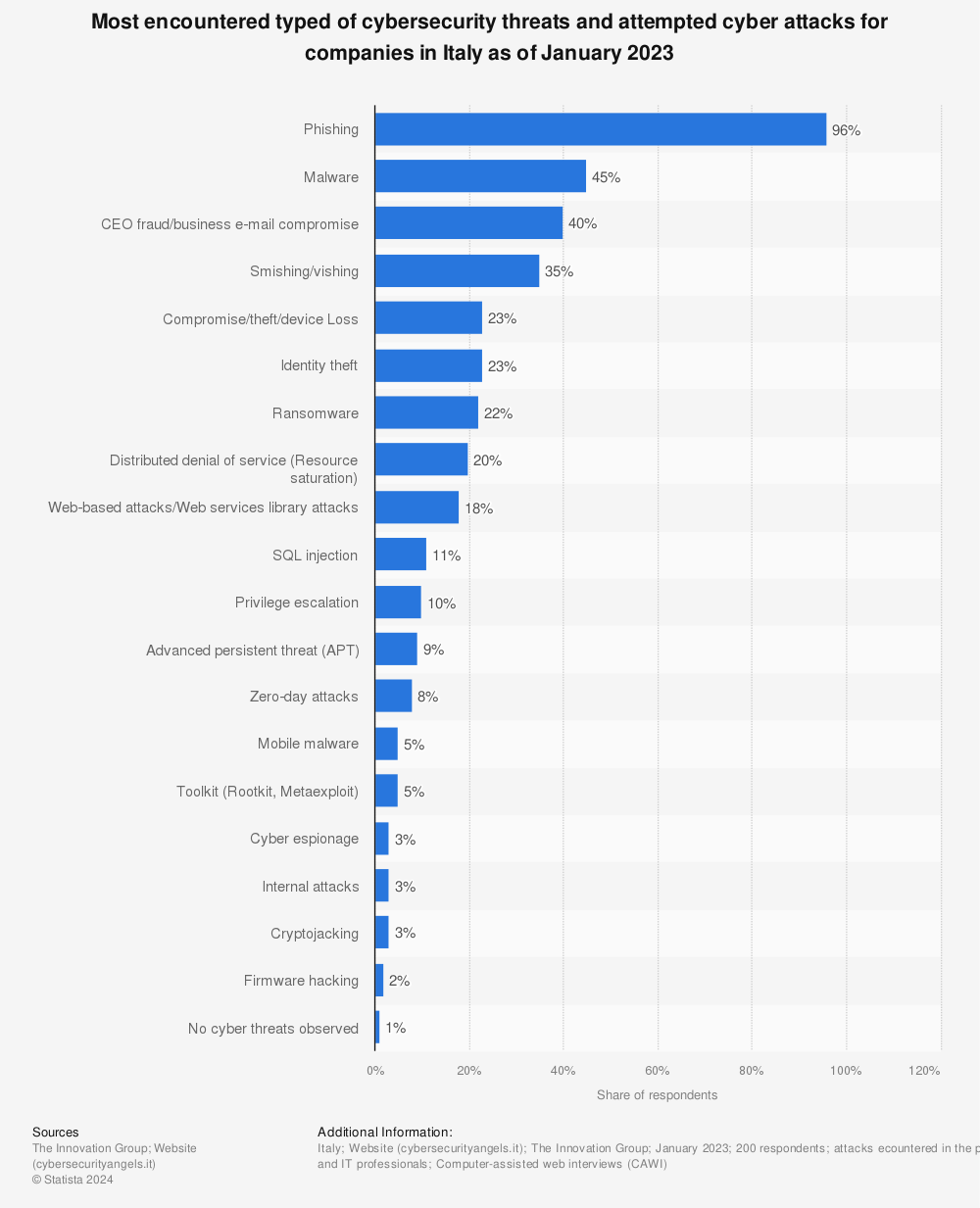 在2023年上半年,一般网络犯罪占意大利公司所受攻击的84%,而黑客行动(利用黑客攻击破坏机构或私人公司,以达到政治或社会目的)占总数的近8%。截至2023年初,网络钓鱼是意大利公司必须抵御的最常见的网络攻击类型,遭遇率为96%。此外,意大利的管理和IT专业人士注意到CEO欺诈和企业电子邮件泄露案件的增加,到2023年初,40%的企业都遇到过这种情况。