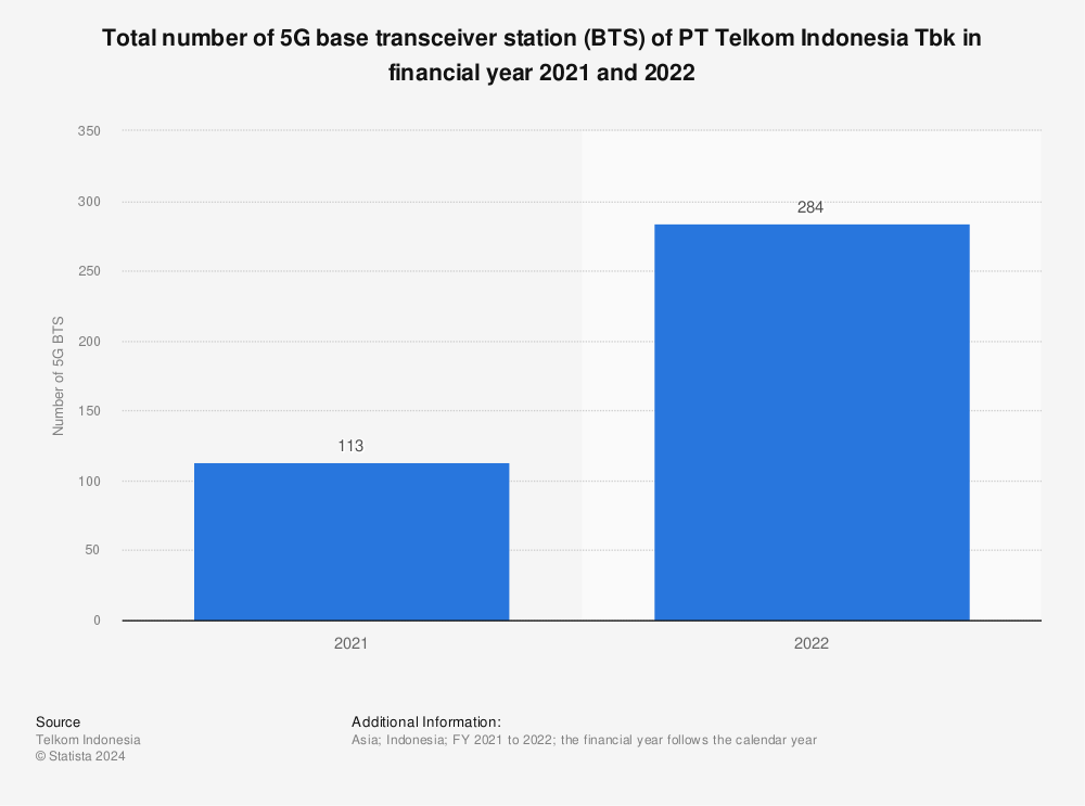 PT Telkom Indonesia Tbk在2021财年和2022财年的5G基站(BTS)总数。数据来源:Statista.com