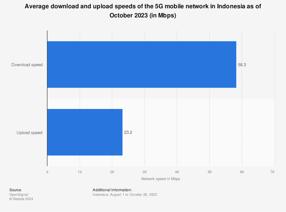 截至2023年10月,印度尼西亚5G移动网络的平均下载和上传速度(单位:Mbps)。数据来源:Statista.com