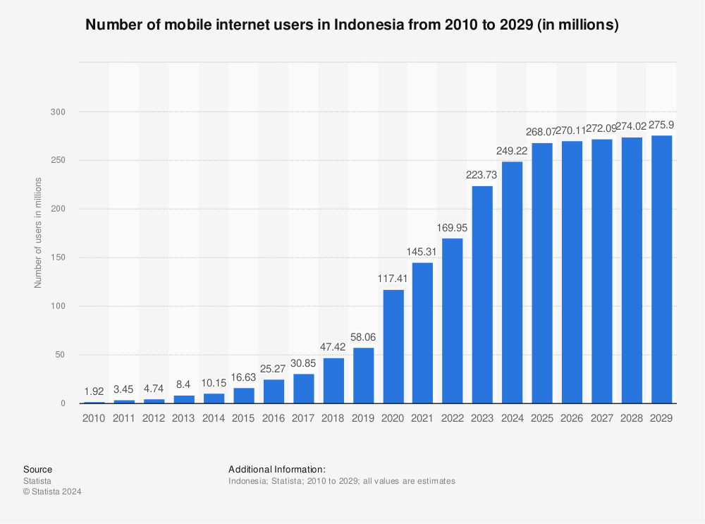 2010-2029年印尼移动互联网用户数量(百万)。数据来源:Statista.com
