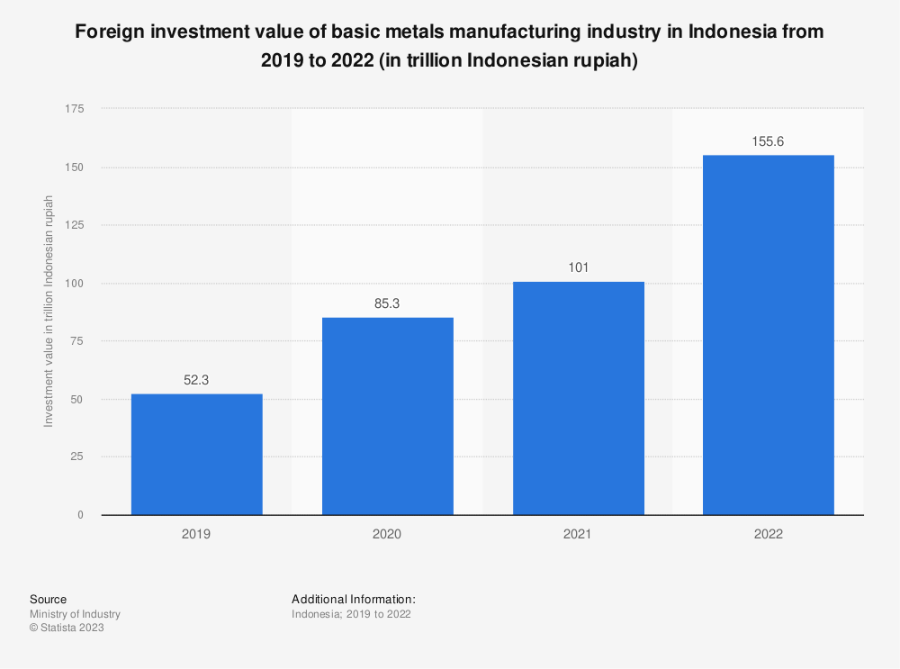 2019-2022年印尼基本金属制造业外商投资总值(万亿印尼盾)。数据来源:Statista.com