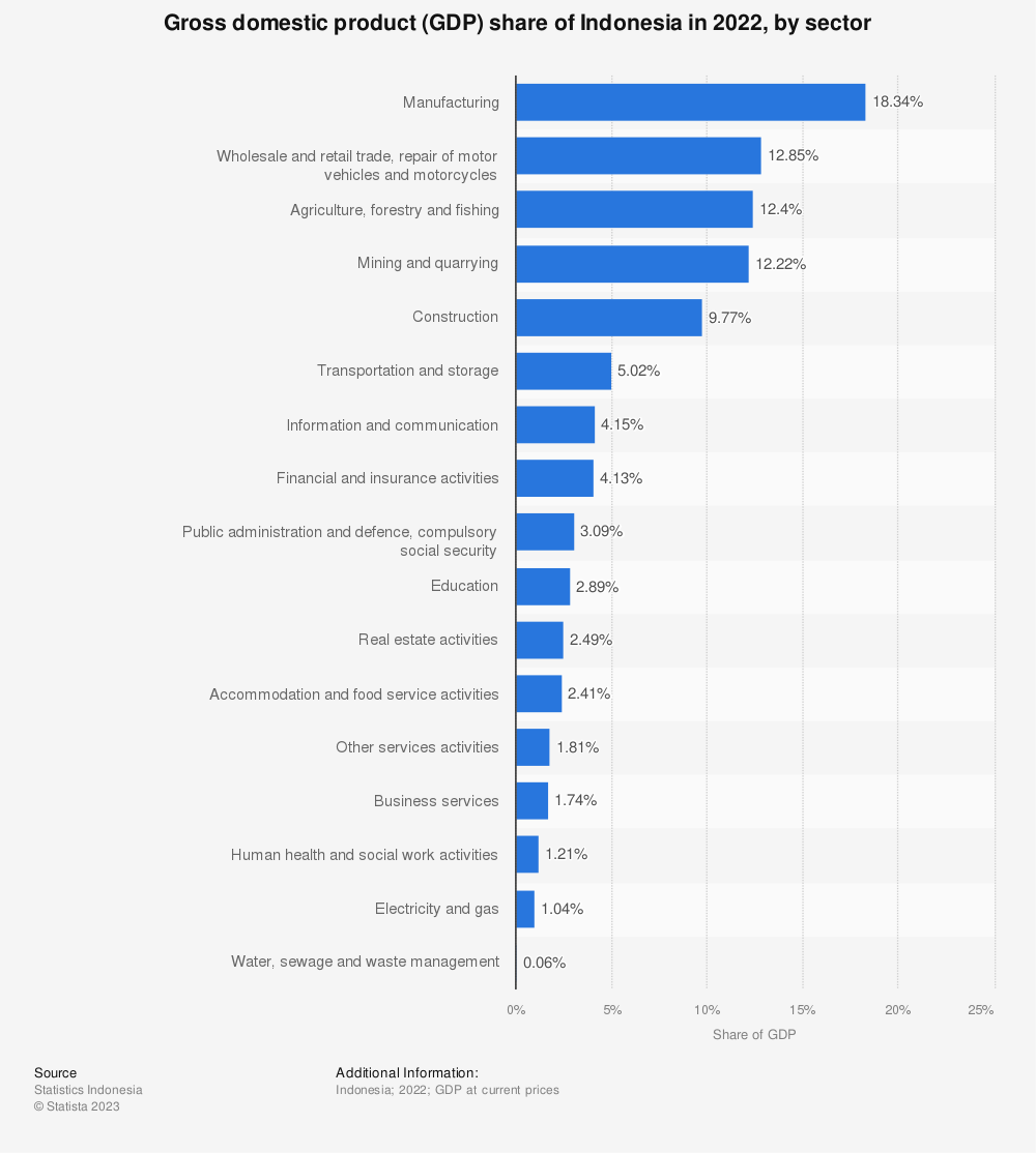 按行业划分,2022年印尼国内生产总值(GDP)份额。数据来源:Statista.com