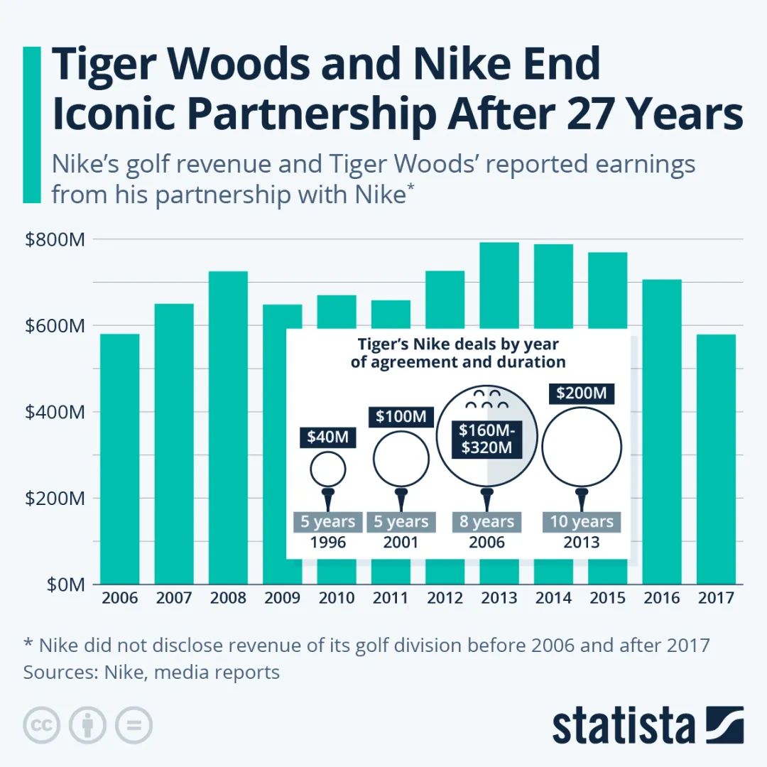 正如我们的图表所示,耐克高尔夫部门的年销售额从未突破10亿美元大关。根据该公司的年度报告,耐克高尔夫业务的收入在2013财年达到顶峰,接近8亿美元,然后在2017年跌破6亿美元,此后耐克公司不再公布其高尔夫业务的收入数据。对于泰格·伍兹来说,他与Swoosh的合作也获得了丰厚的回报。据媒体报道,在过去的27年里,他与这家总部位于俄勒冈州的体育用品巨头签订的四份合同至少价值5亿美元。