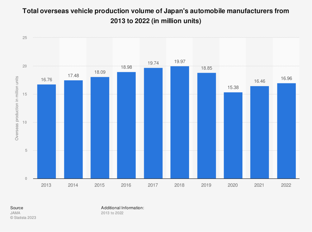 2013-2022年日本汽车制造商海外汽车总产量(百万辆)。数据来源:Statista.com