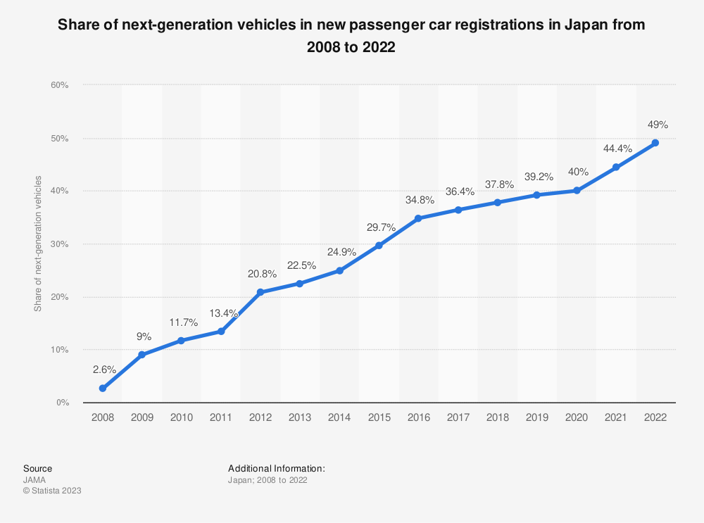 2008年至2022年日本新乘用车注册中下一代汽车的份额