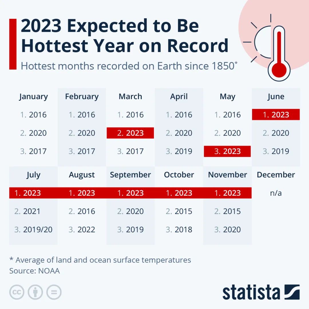数据显示,2023年6月至11月是自1850年有记录以来最热的月份,其中2023年7月是最热的。2023年还出现了有史以来第二热的3月和第三热的5月。