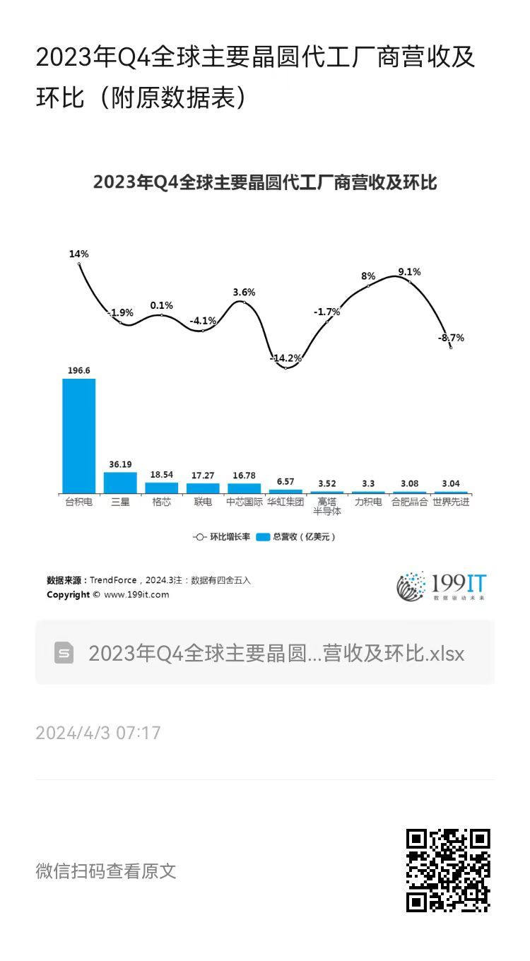 - 2023年Q4全球主要晶圆代工厂商营收市场份额(附原数据表)