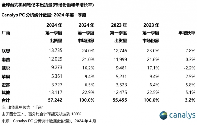 据 Canalys最新数据显示,2024年第一季度,全球个人电脑(PC)市场呈现出健康的增长态势,台式机和笔记本电脑的总出货量同比增长3.2%,达5720万台。笔记本(包括移动工作站)的出货量增长4.2%,达到4510万台,而台式机(包括台式工作站)的出货量则相对稳定,仅下降0.4%,达到1210万台。