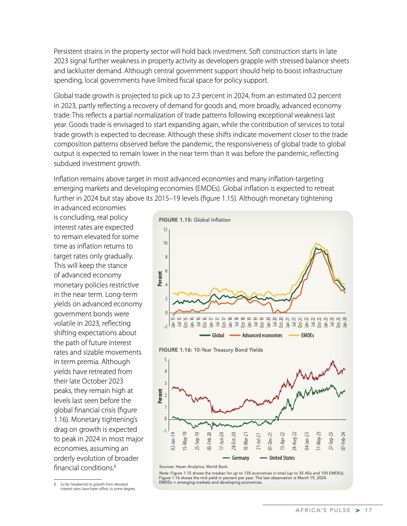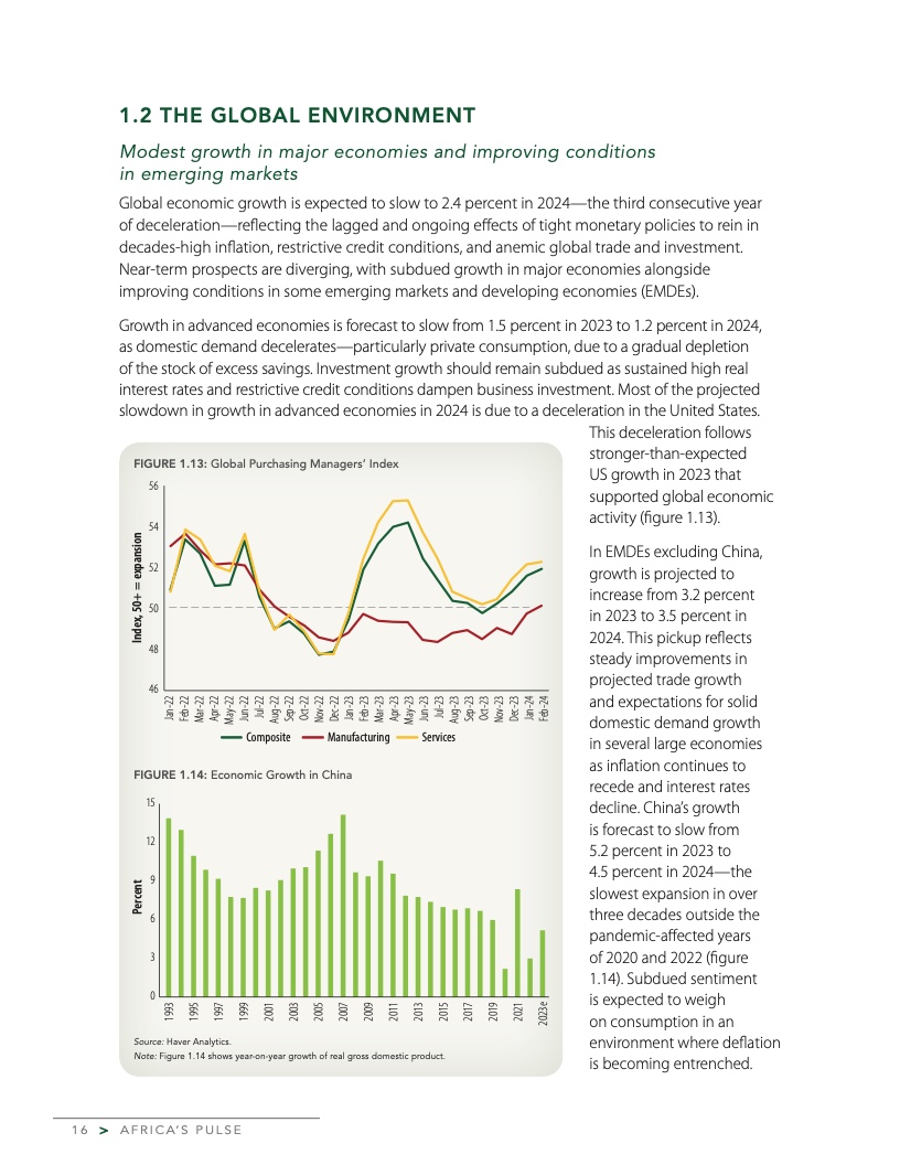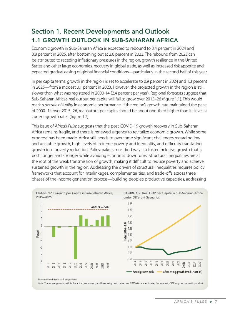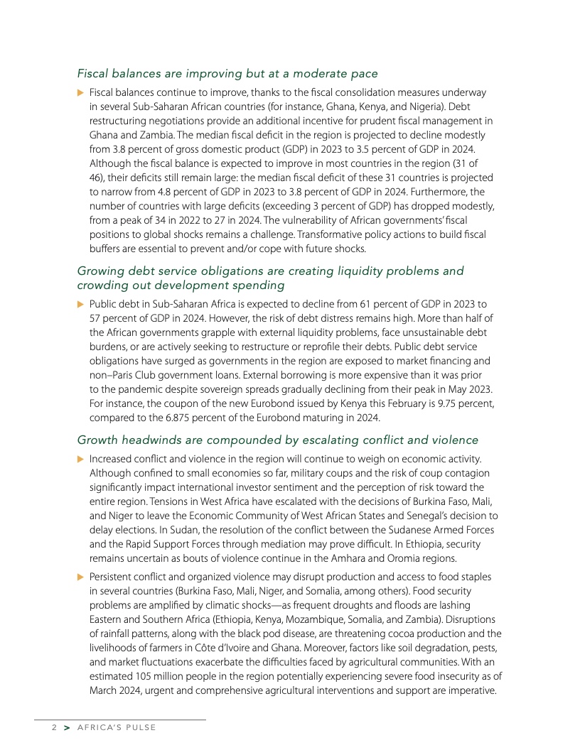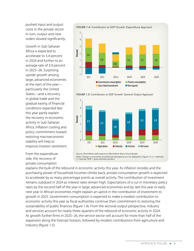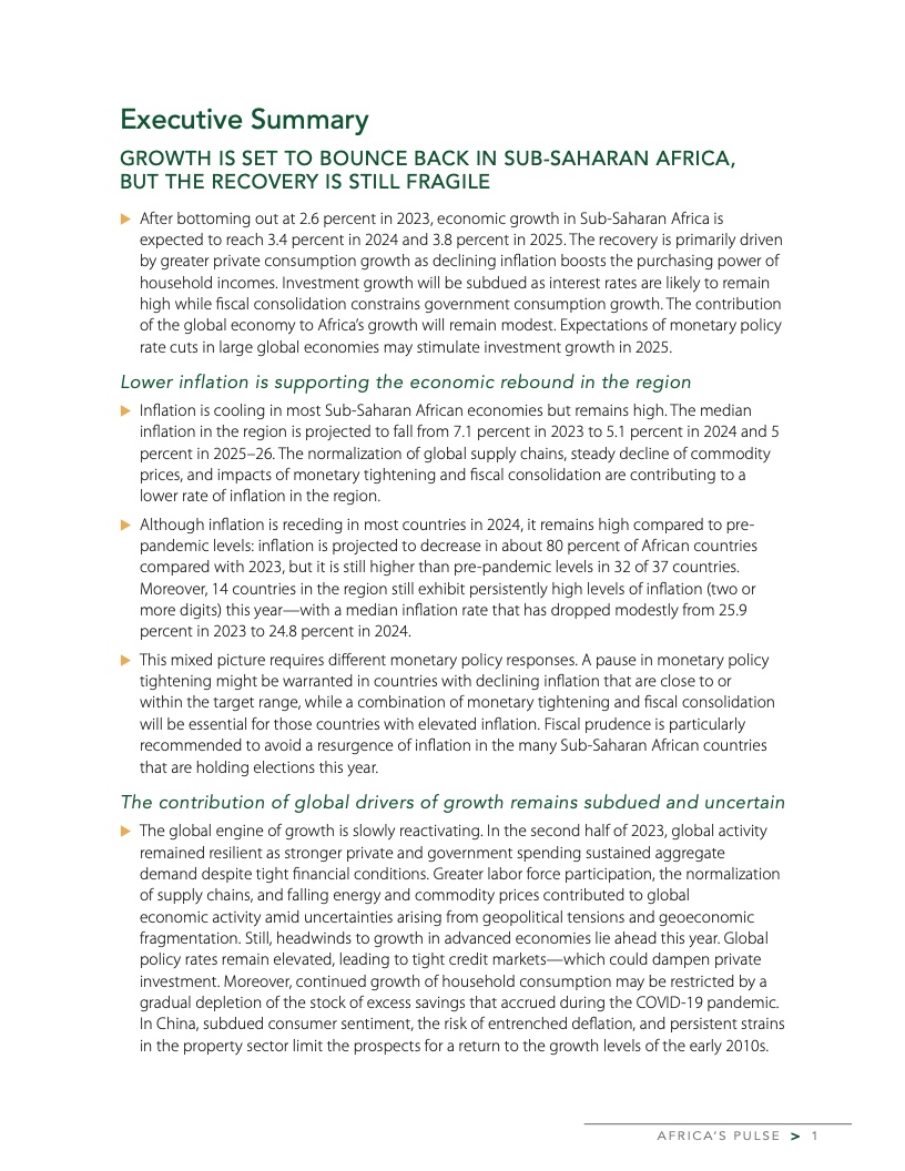 世界银行在名为《非洲的脉搏》的报告中预测,经济增长将在2024年反弹,从2023年的低点2.6%升至2024年的3.4%,到2025年升至3.8%。然而,这种复苏仍然脆弱。虽然大多数经济体的通胀率都在降温,从7.1%的中位数下降到2024年的5.1%,但与新冠疫情之前的水平相比仍处于高位。