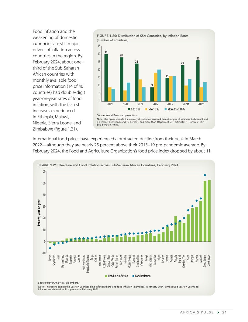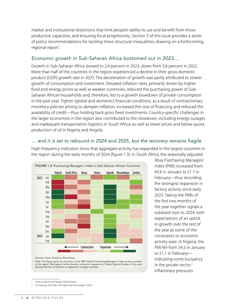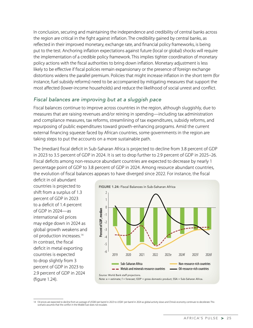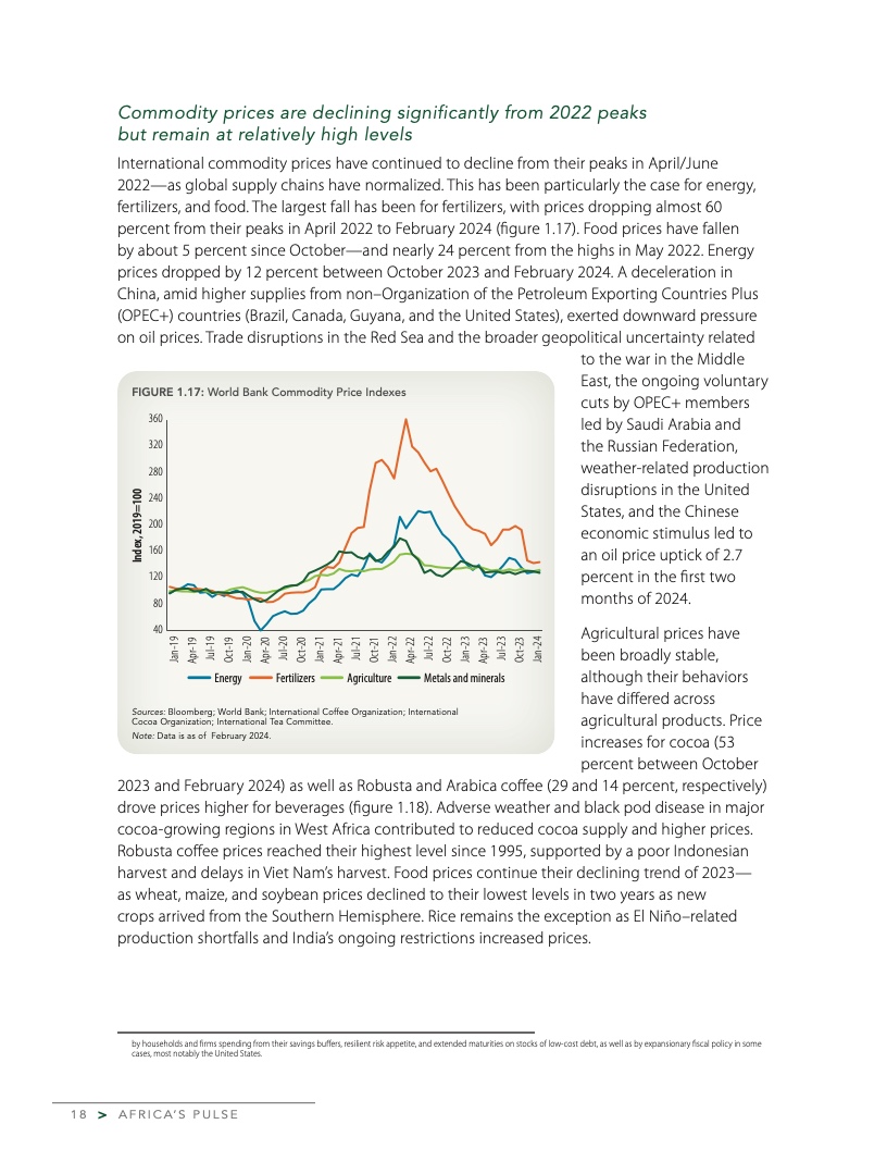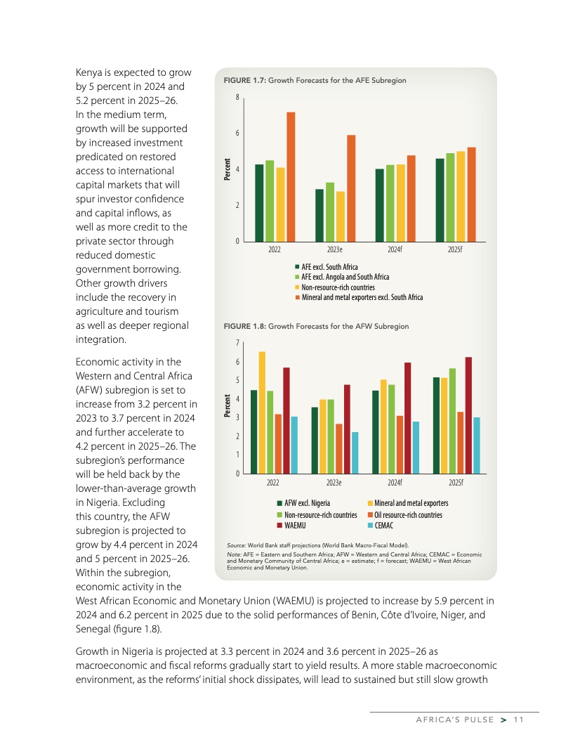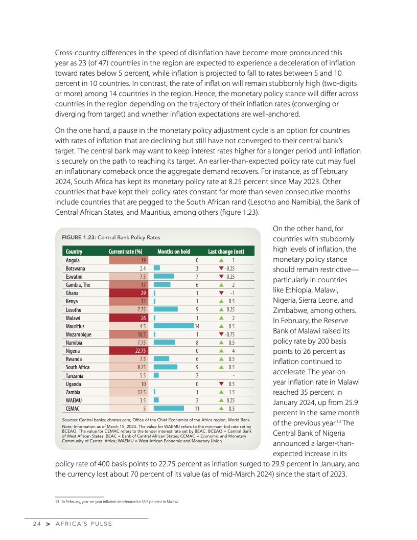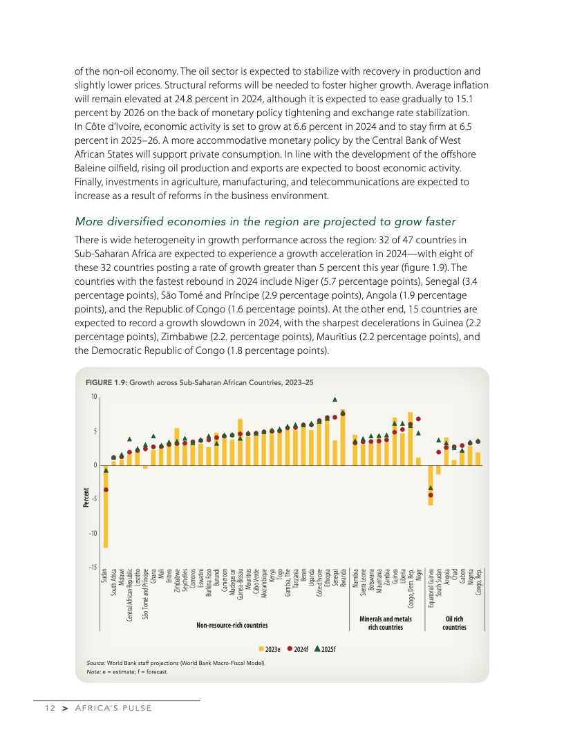 世界银行在名为《非洲的脉搏》的报告中预测,经济增长将在2024年反弹,从2023年的低点2.6%升至2024年的3.4%,到2025年升至3.8%。然而,这种复苏仍然脆弱。虽然大多数经济体的通胀率都在降温,从7.1%的中位数下降到2024年的5.1%,但与新冠疫情之前的水平相比仍处于高位。