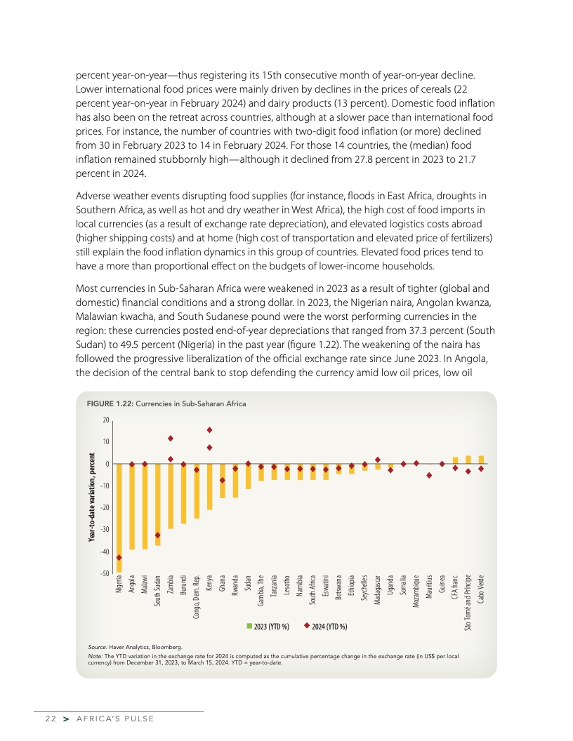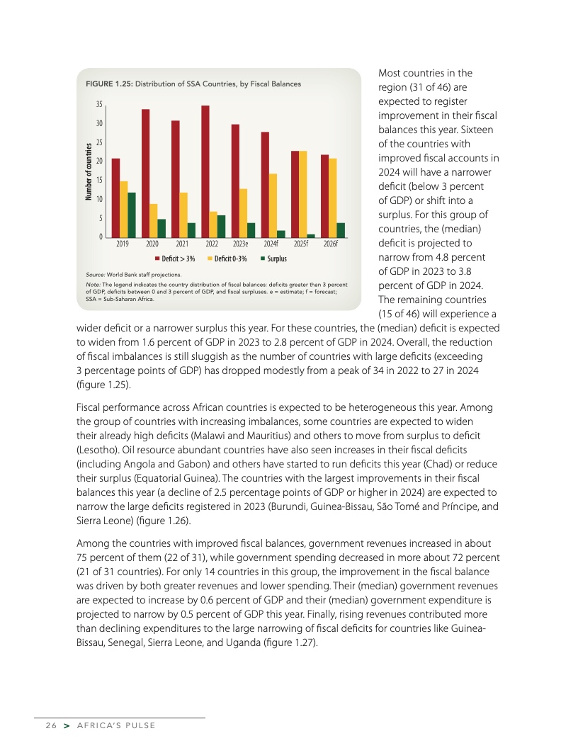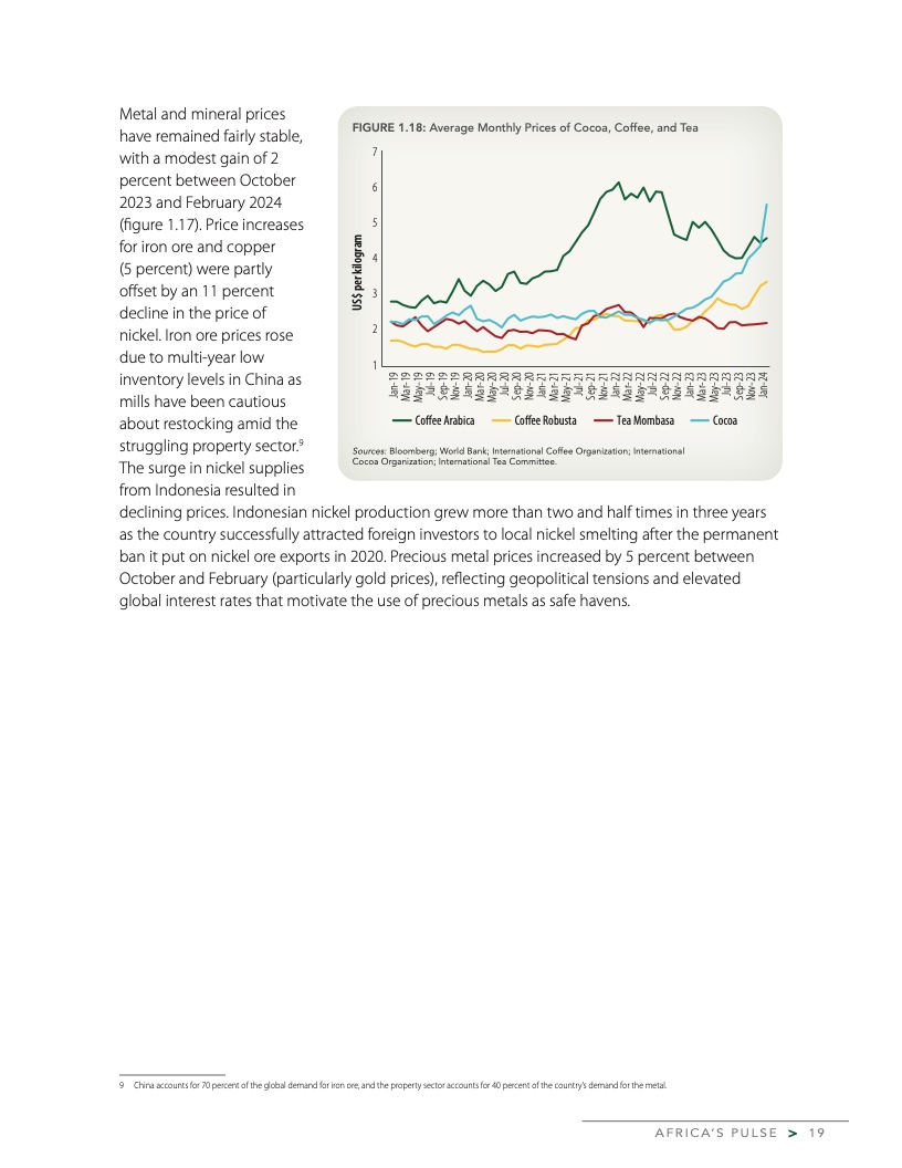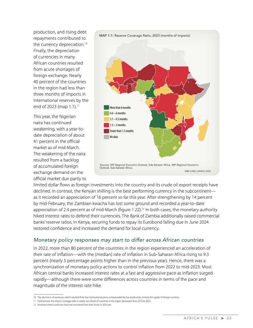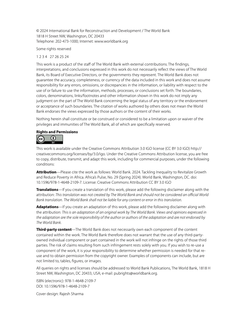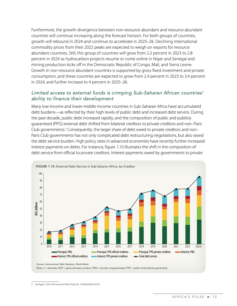 世界银行在名为《非洲的脉搏》的报告中预测,经济增长将在2024年反弹,从2023年的低点2.6%升至2024年的3.4%,到2025年升至3.8%。然而,这种复苏仍然脆弱。虽然大多数经济体的通胀率都在降温,从7.1%的中位数下降到2024年的5.1%,但与新冠疫情之前的水平相比仍处于高位。