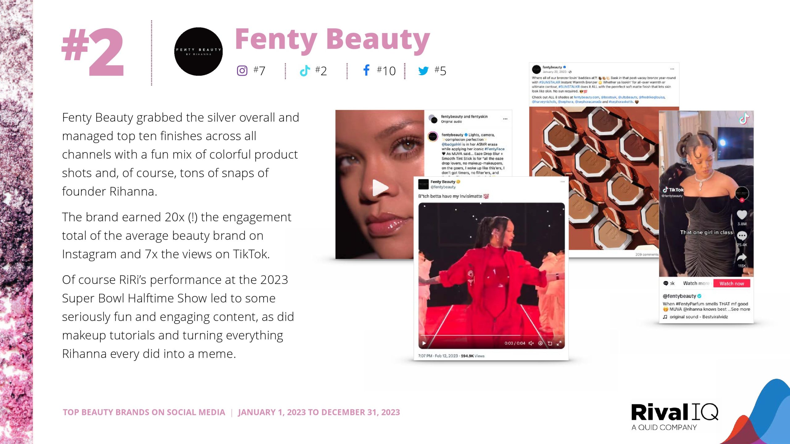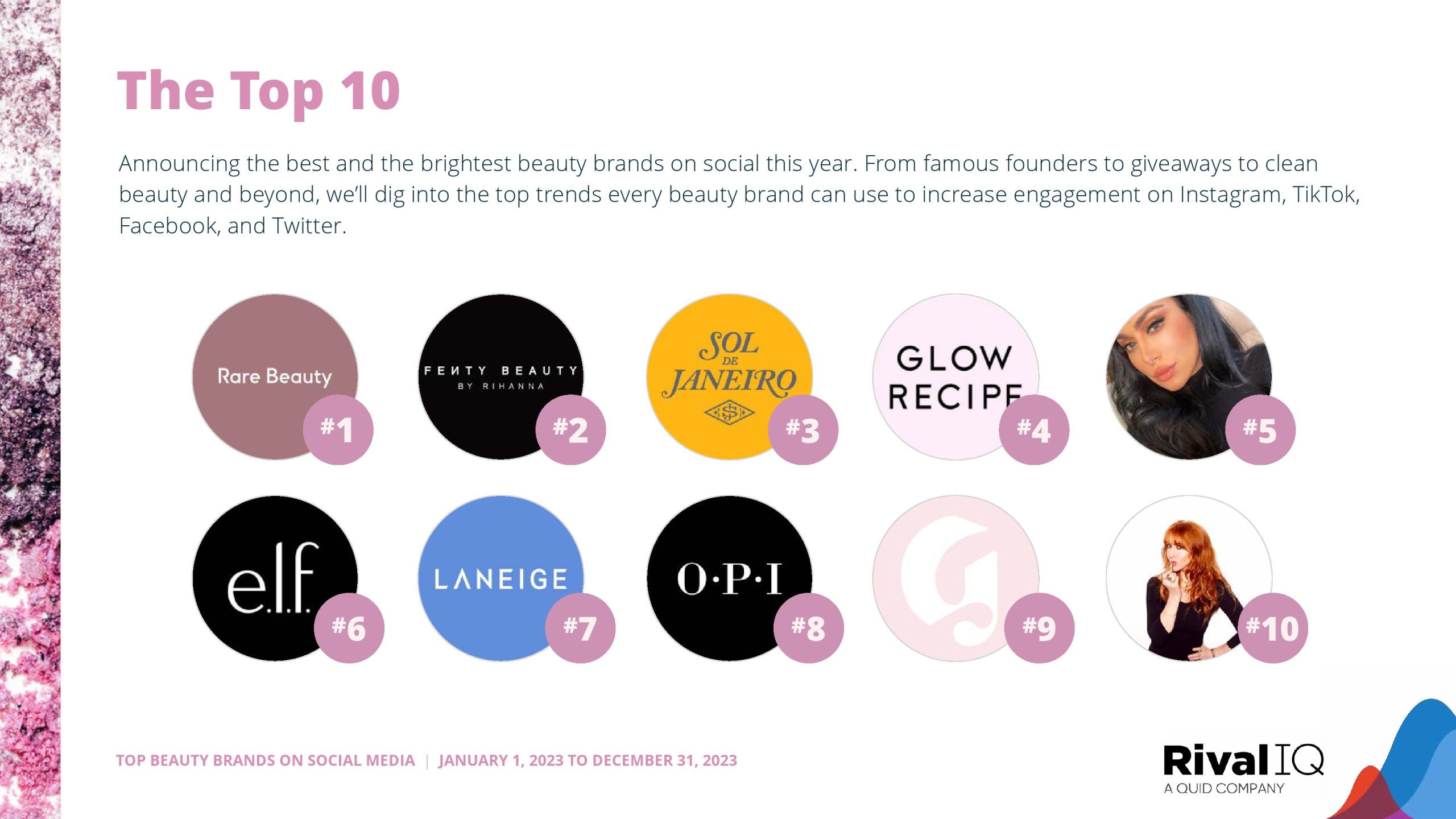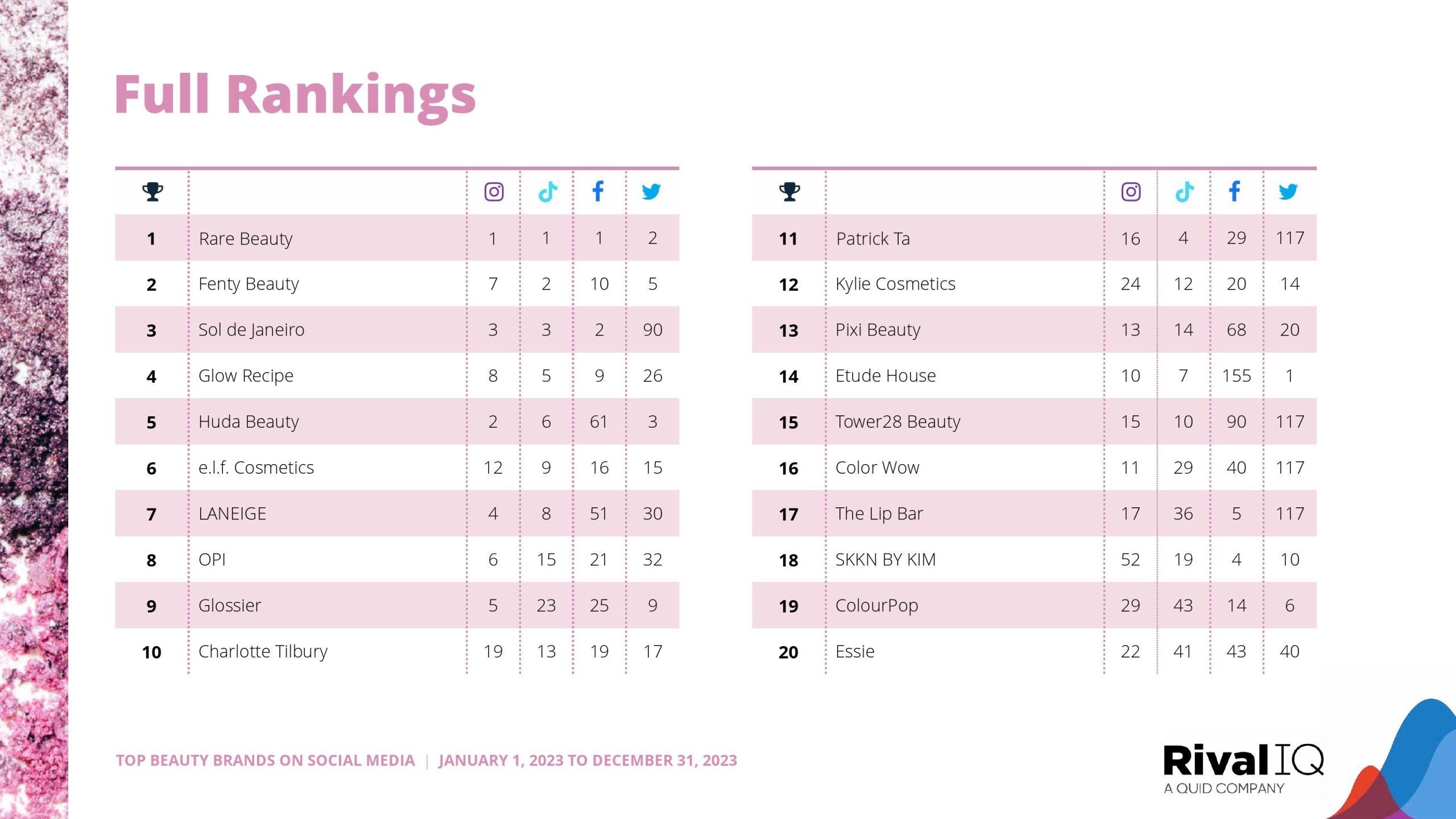Rare Beauty在去年获得第二名后,今年摘得TikTok的金牌。2023年TikTok冠军Kylie Cosmetics今年没有进入前十,但Fenty Beauty、Huda Beauty、Sol de Janeiro和LANEIGE今年都成功地再次取得了强劲的成绩。