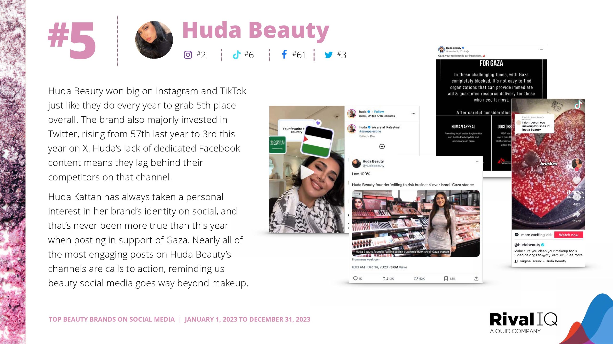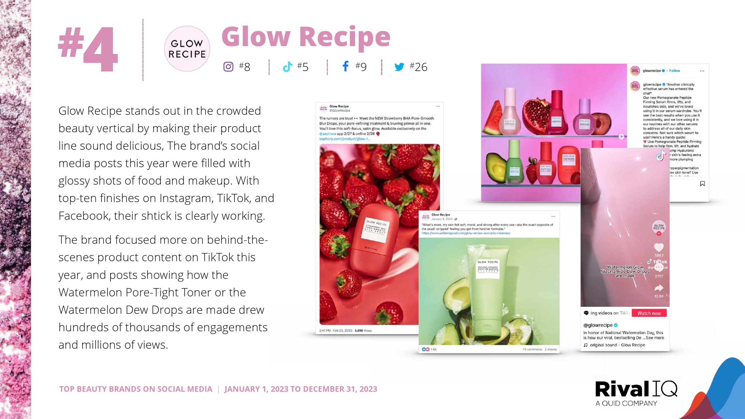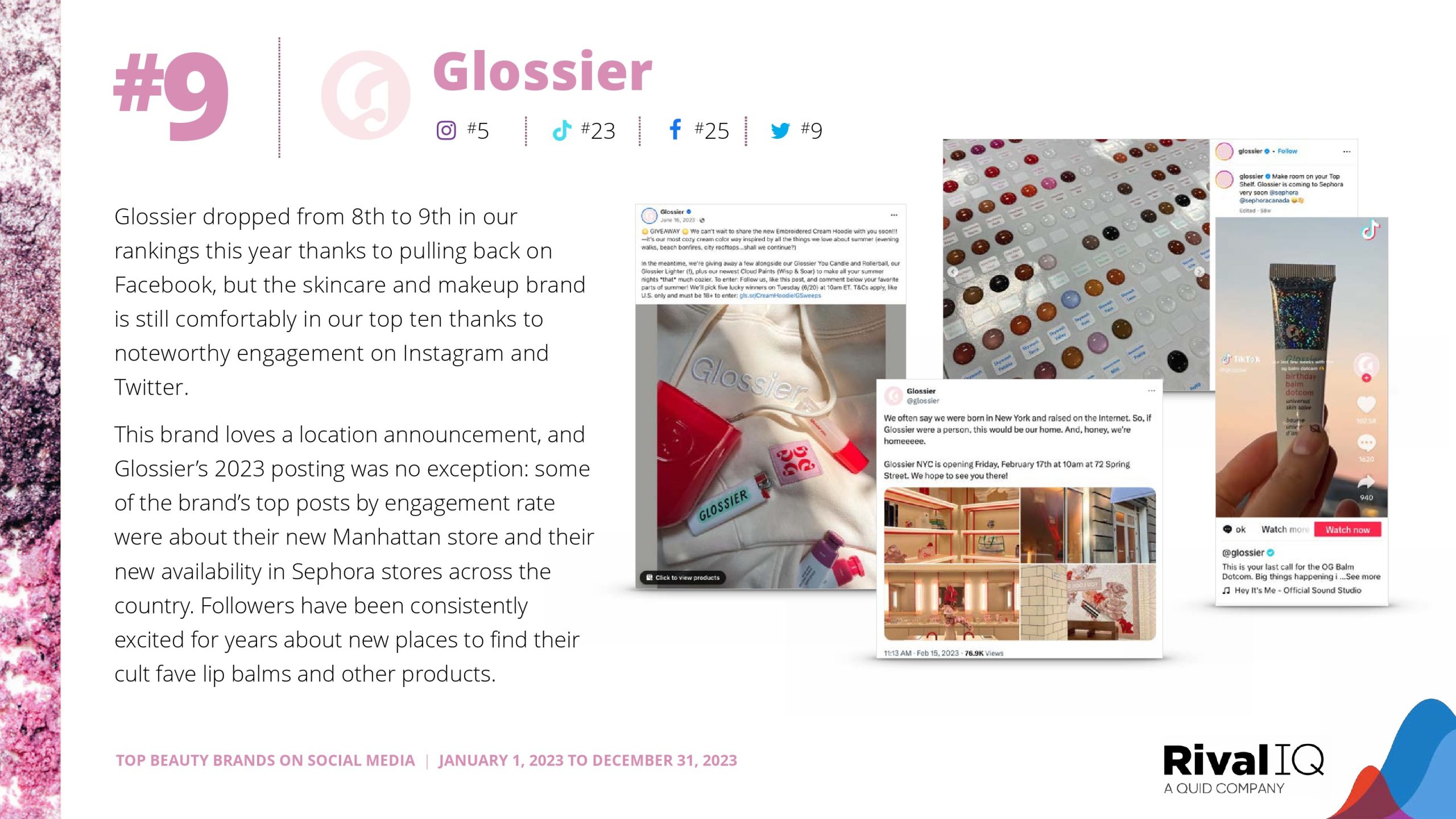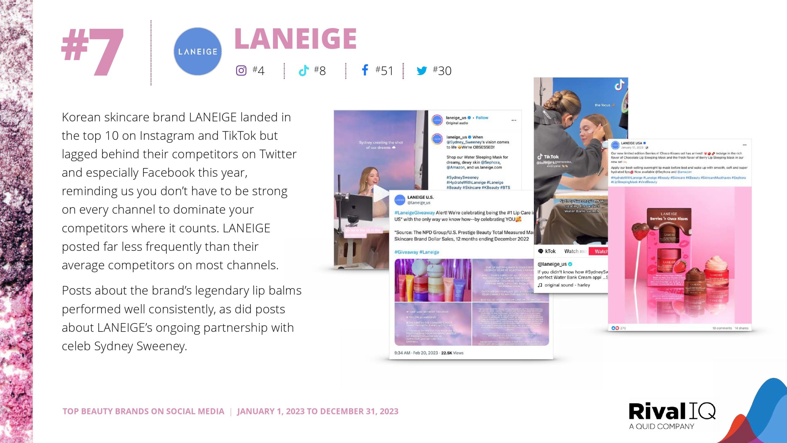 Rare Beauty在去年获得第二名后,今年摘得TikTok的金牌。2023年TikTok冠军Kylie Cosmetics今年没有进入前十,但Fenty Beauty、Huda Beauty、Sol de Janeiro和LANEIGE今年都成功地再次取得了强劲的成绩。