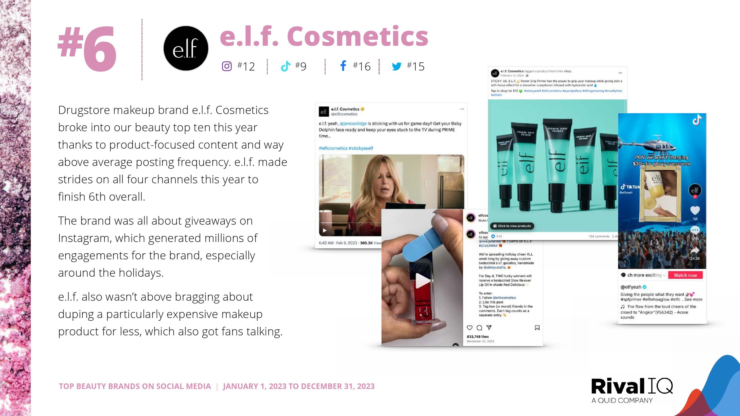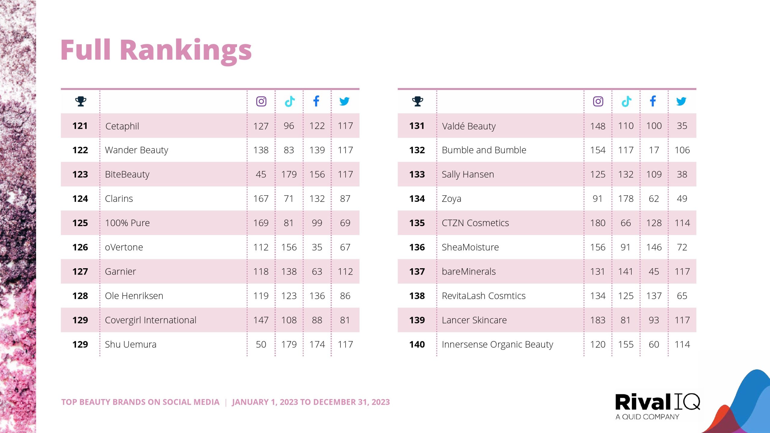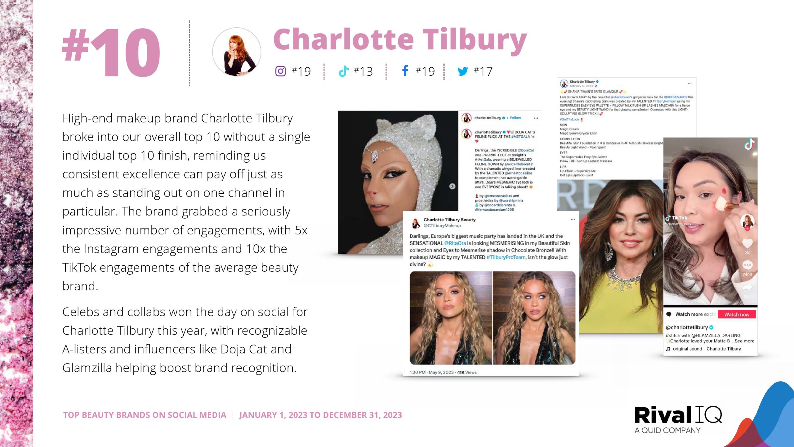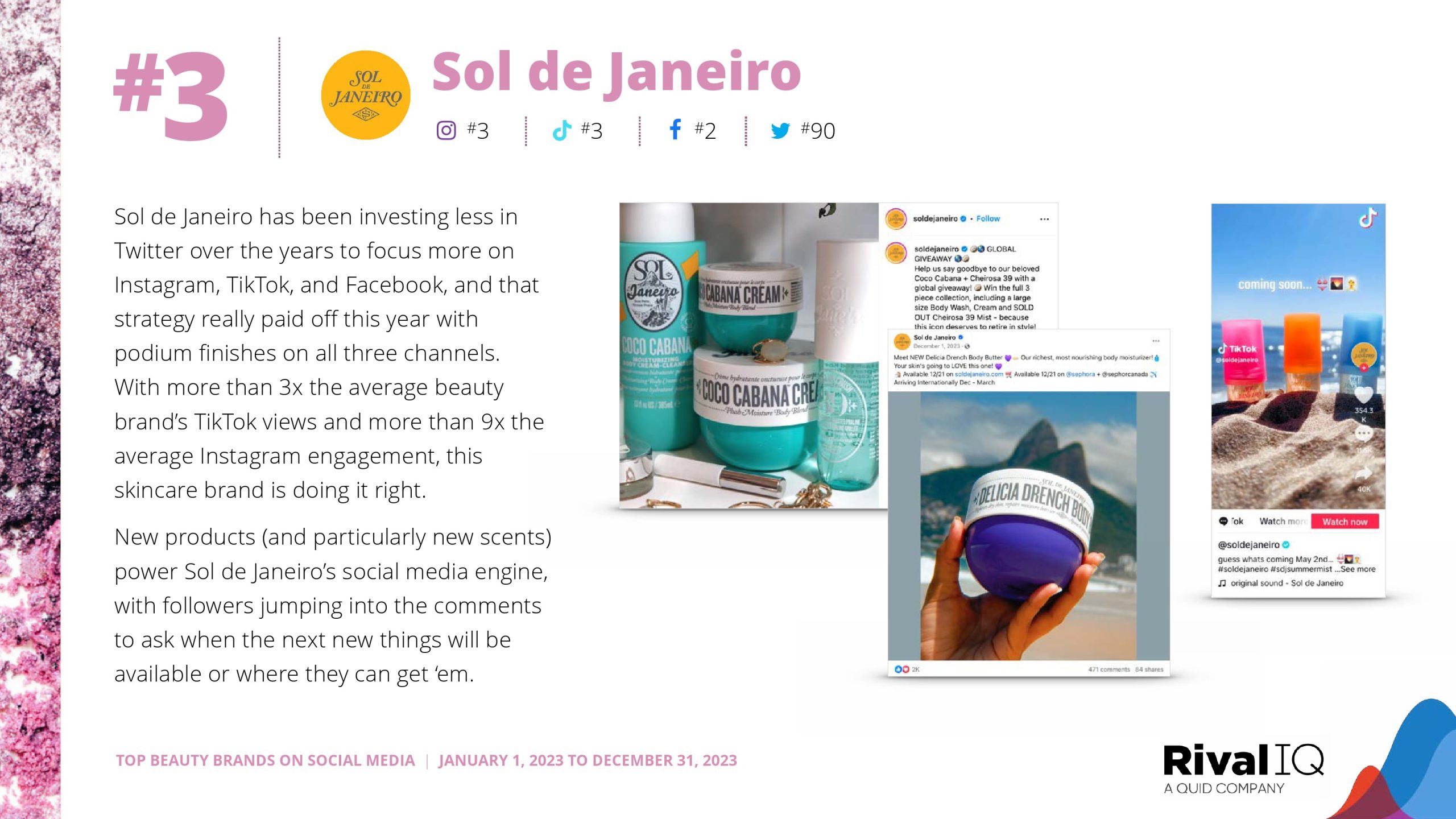 Sol de Janeiro再次紧随赛琳娜的品牌。玫琳凯排名第三,在Facebook上的表现比今年研究的任何其他渠道都要好得多。