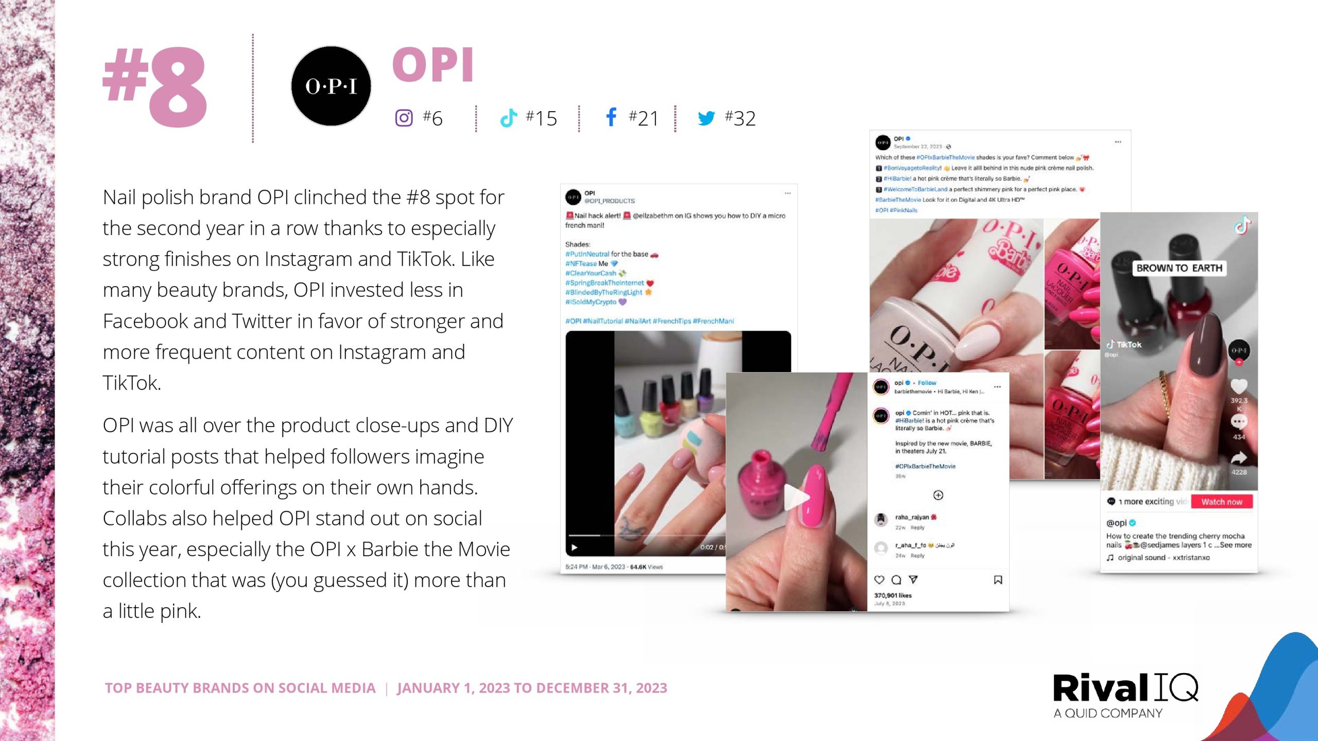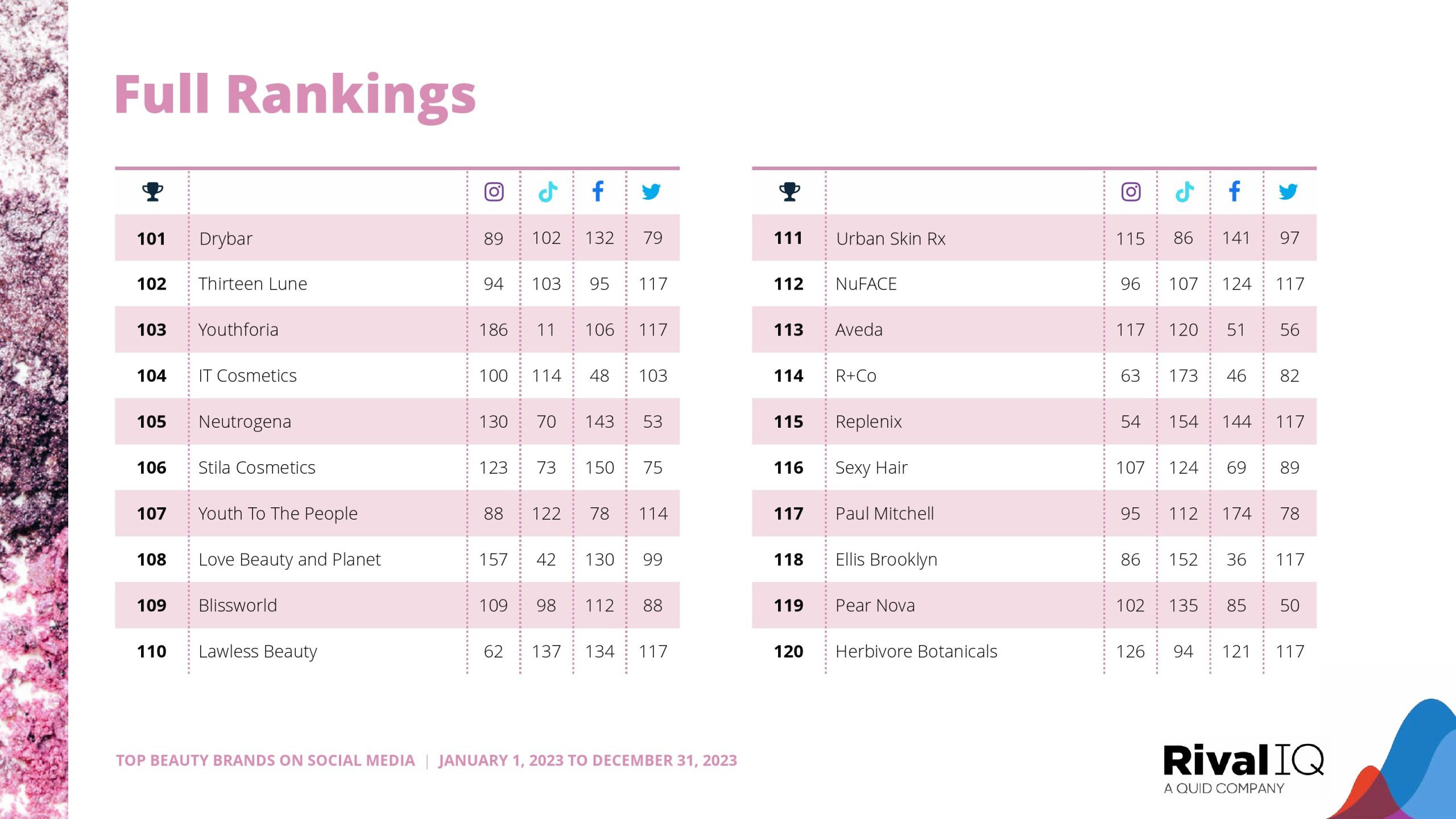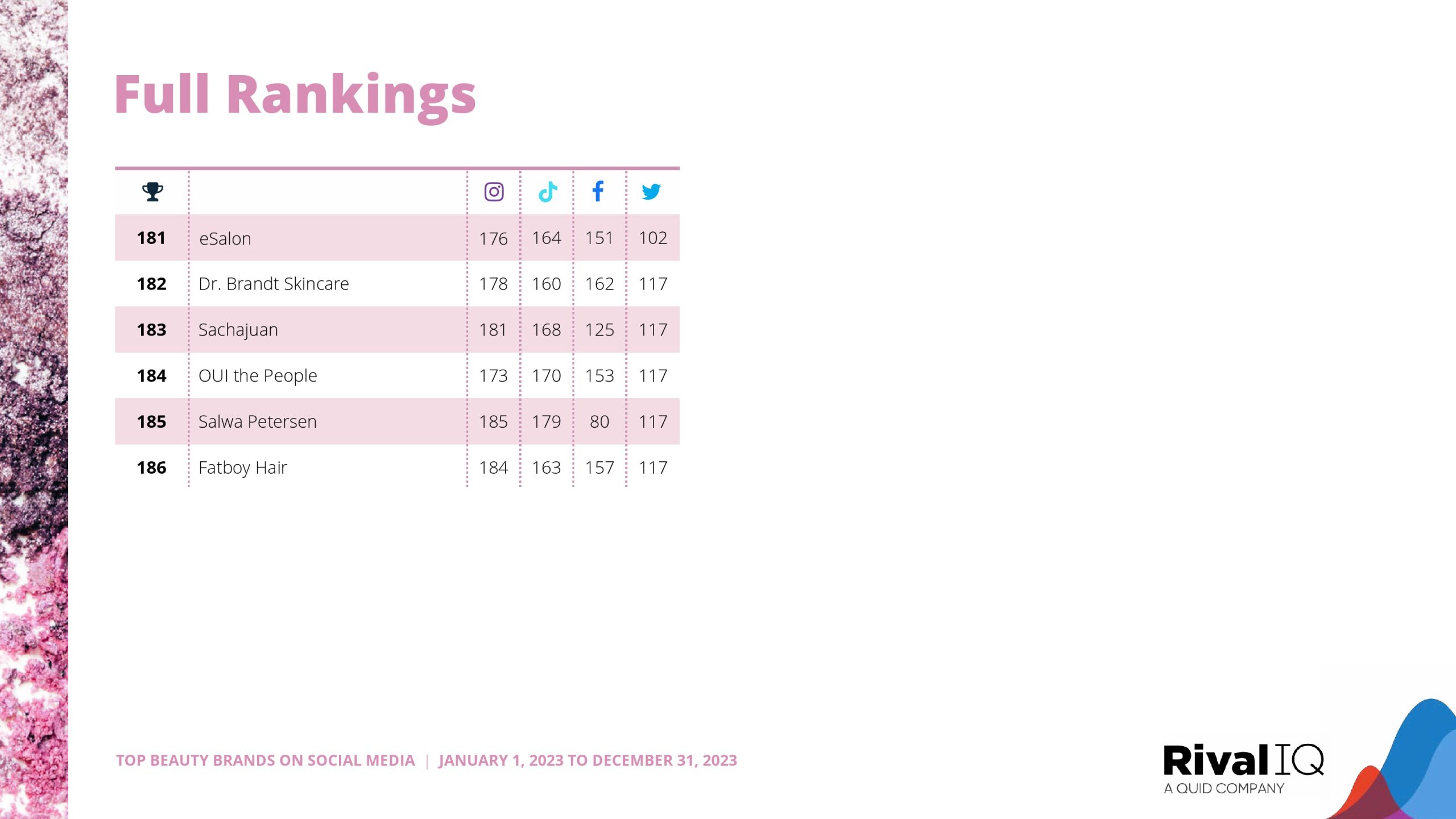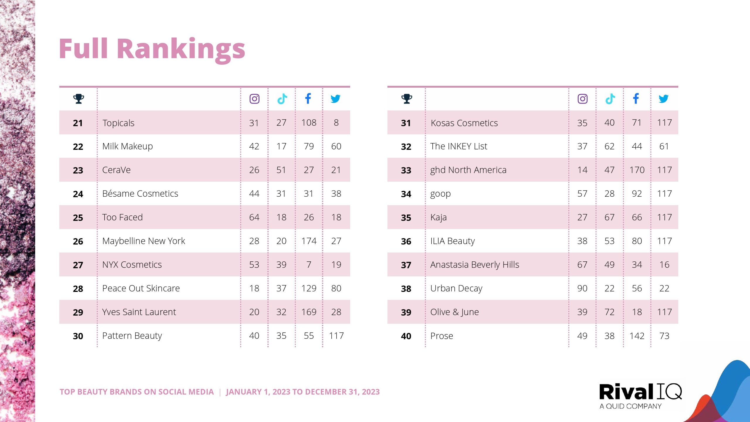 Sol de Janeiro再次紧随赛琳娜的品牌。玫琳凯排名第三,在Facebook上的表现比今年研究的任何其他渠道都要好得多。