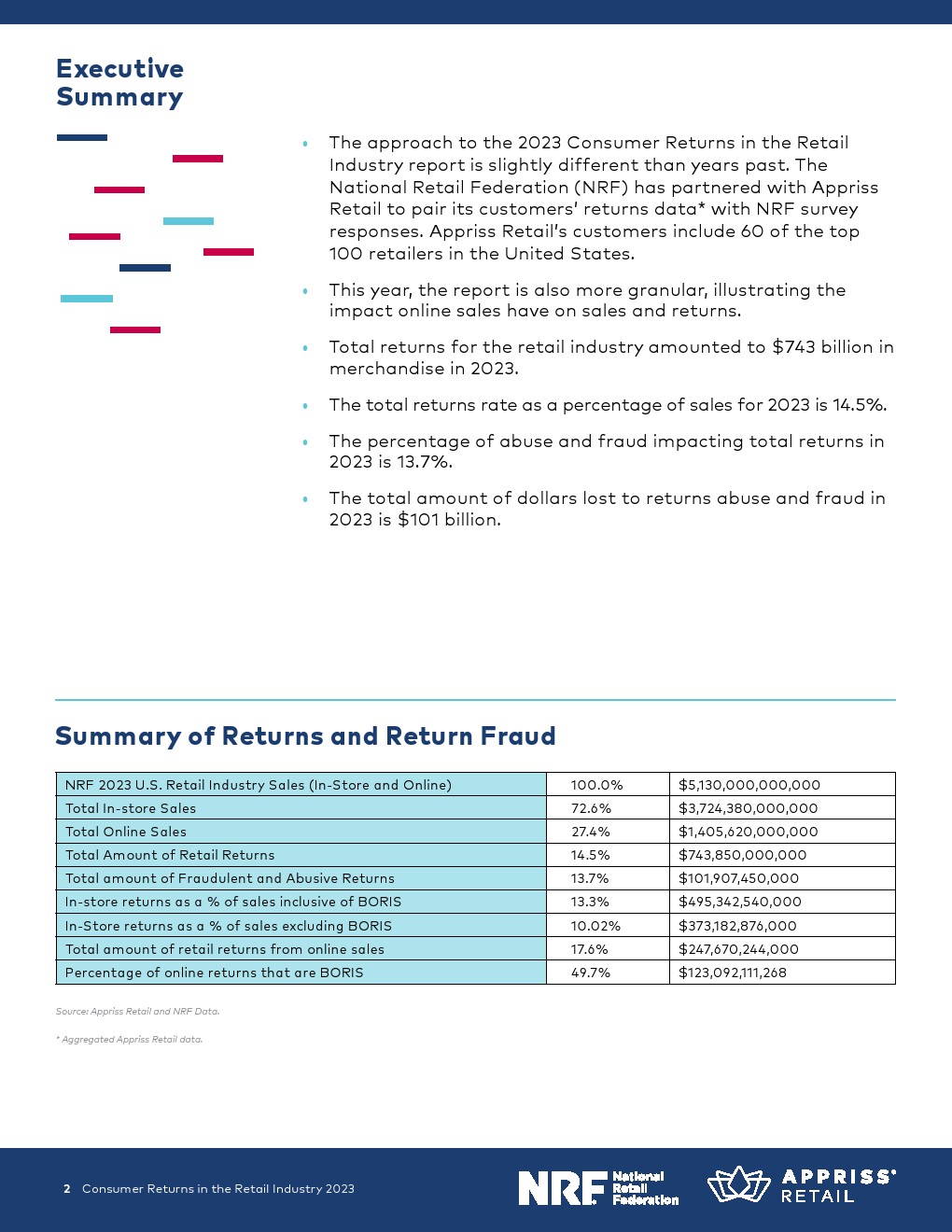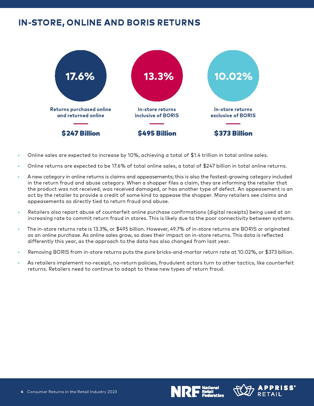 店内退货率为13.3%,即4950亿美元。49.7%的店内退货是BORIS或源于在线购买。随着在线销售的增长,它们对实体店退货的影响也在扩大。