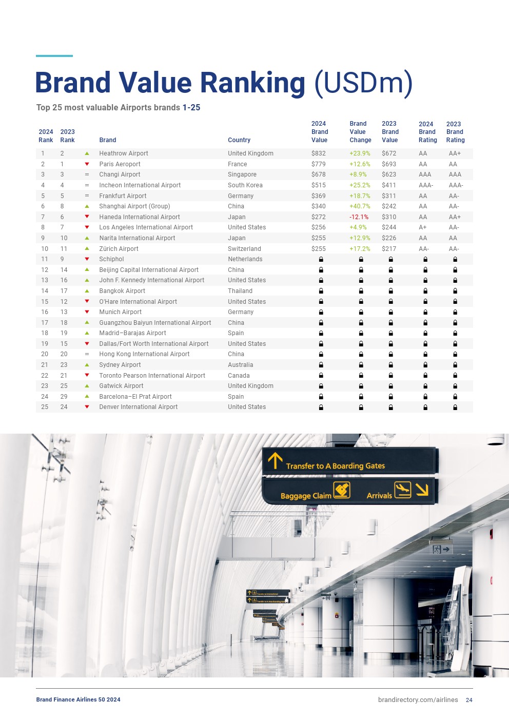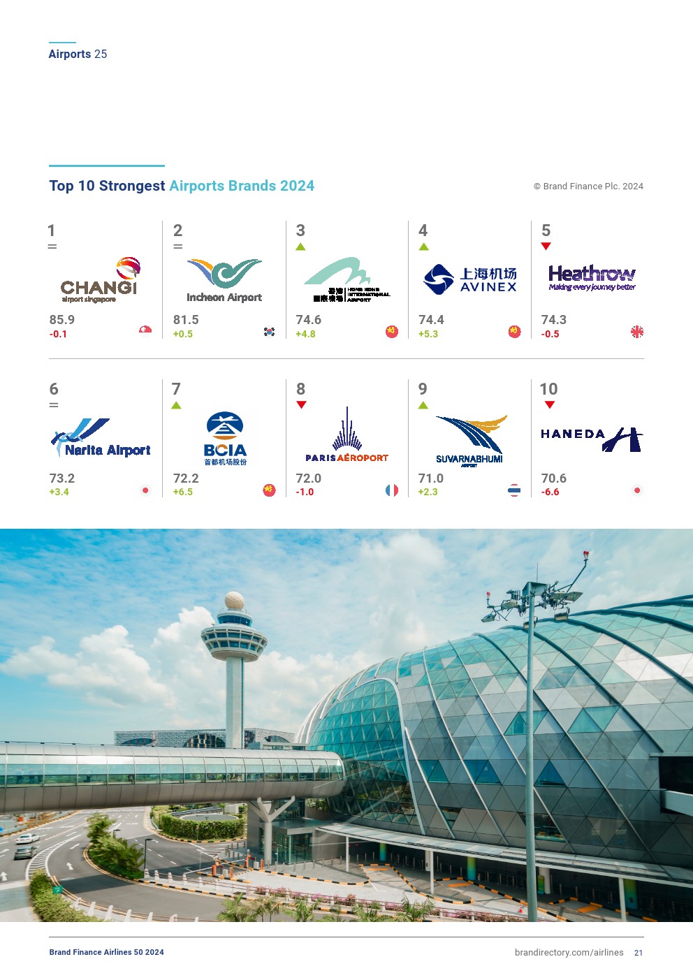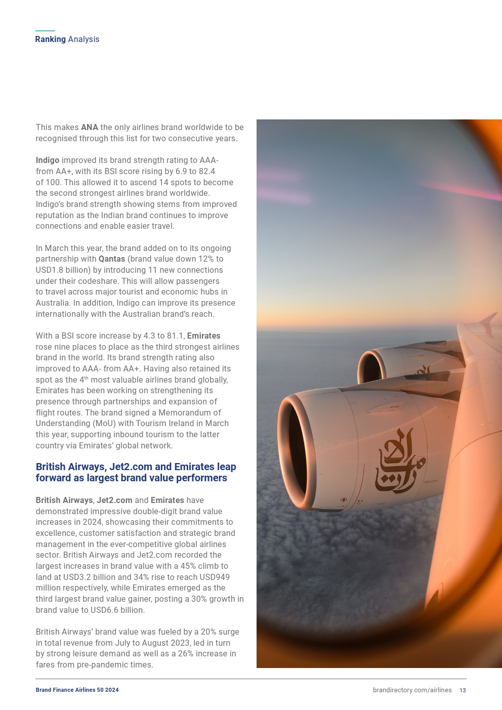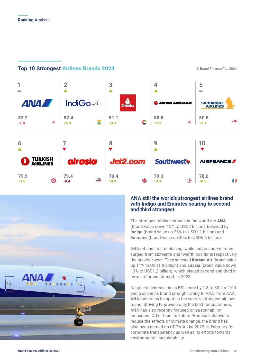 全球最强的航空公司品牌是全日空(品牌价值下降15%,达到20亿美元),其次是靛蓝(品牌价值增长26%,达到11亿美元)和阿联酋航空。此前,大韩航空(品牌价值上升11%,达到19亿美元)和亚航(品牌价值下降13%,达到12亿美元)在2023年的品牌实力排名中分别位居第二和第三位。