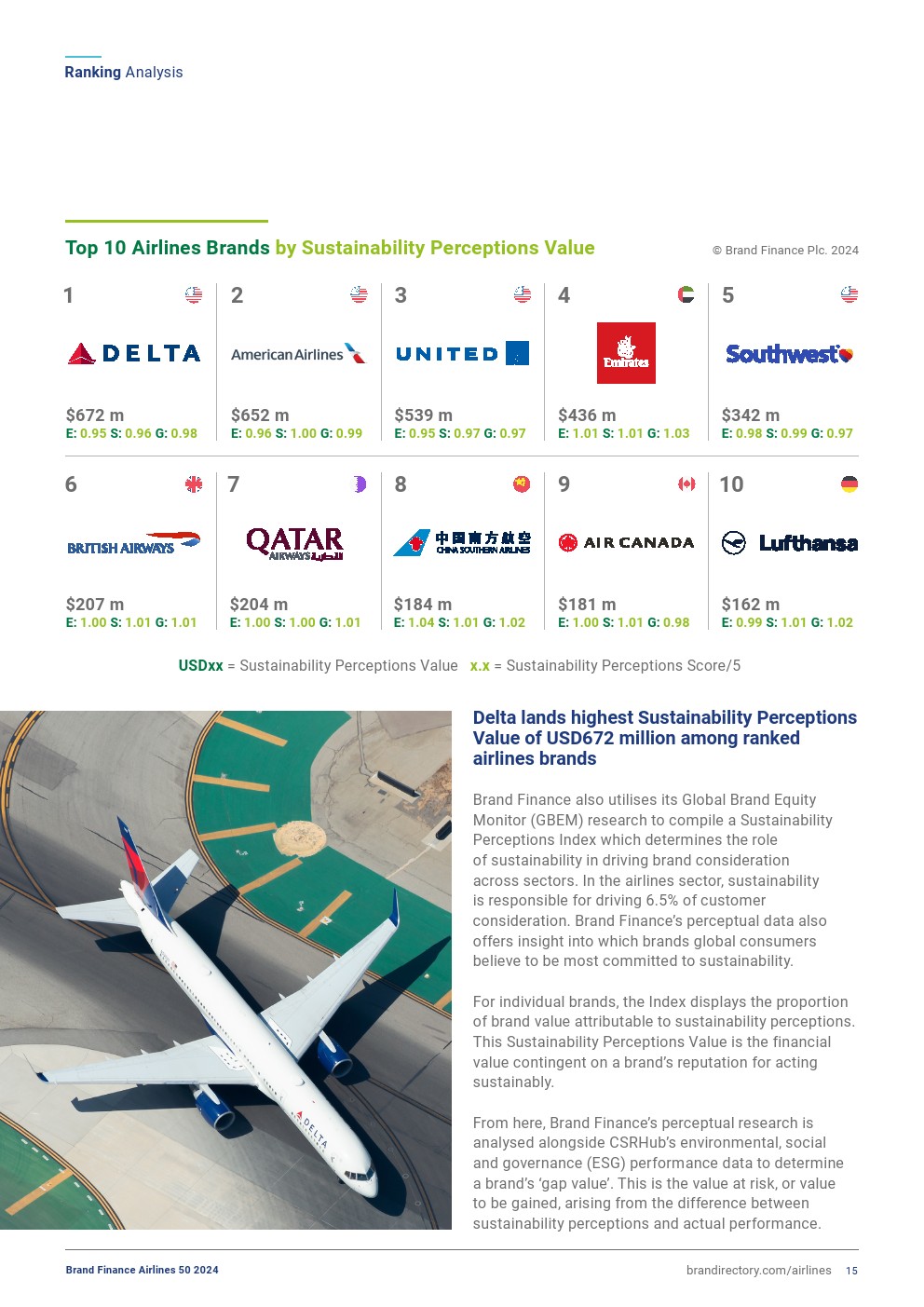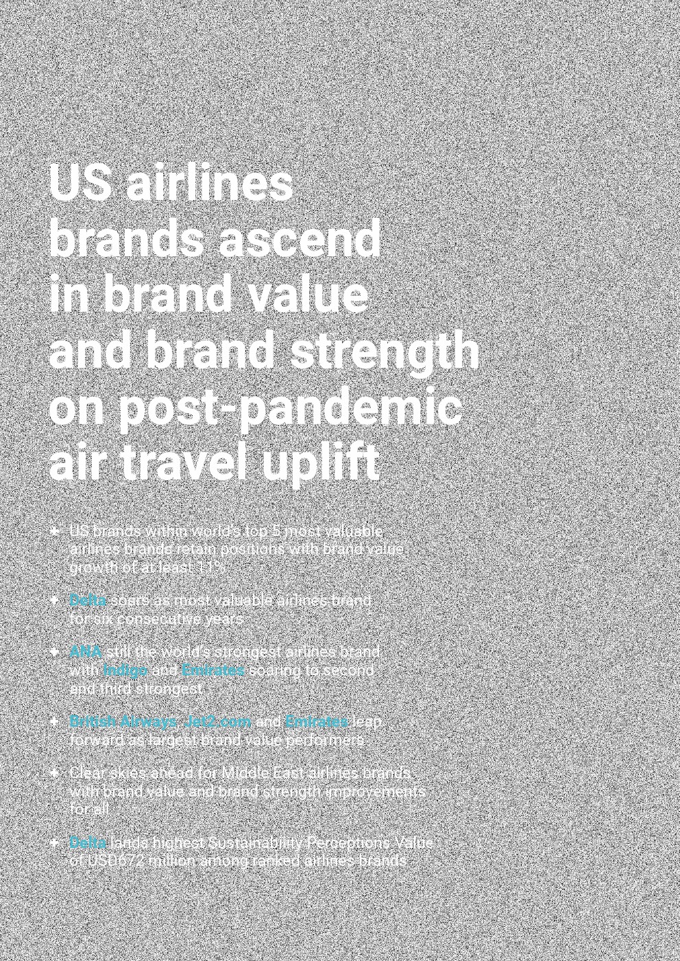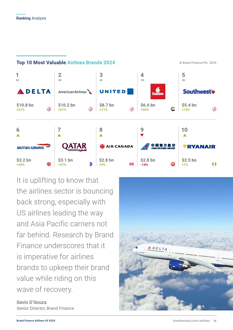 全球五大最有价值的航空公司品牌的品牌价值至少增长了11%。美国达美航空(品牌价值增长21%,达到108亿美元)是今年最具价值航空公司。同样,其他美国品牌——美国航空公司(品牌价值增长21%,达到102亿美元)、美国联合航空公司(品牌价值增长11%,达到87亿美元)和西南航空公司(品牌价值增长15%,达到54亿美元)保持第二、第三和第五位。阿联酋航空公司(品牌价值增长30%,达到66亿美元)跻身全球最具价值航空公司品牌前五名,蝉联全球第四大最有价值航空公司品牌。