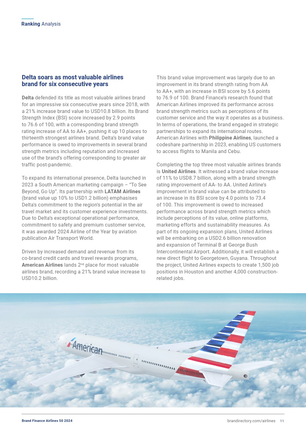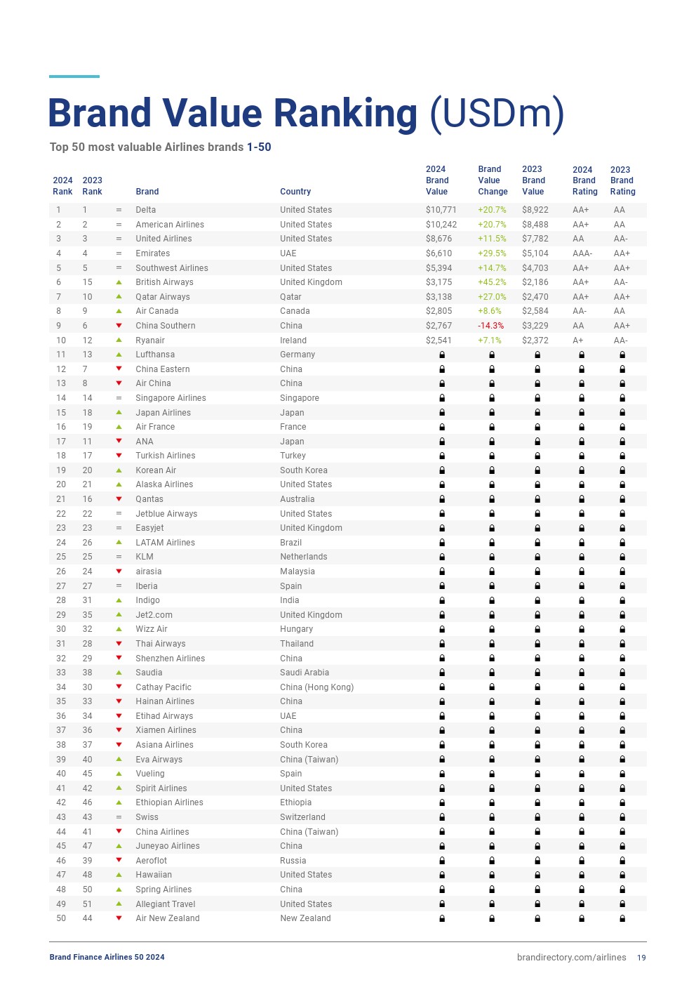 自2018年以来,达美航空连续六年蝉联最有价值航空公司品牌,品牌价值增长21%,达到108亿美元。其品牌实力指数(BSI)得分上升2.9分至76.6分(满分100分),相应的品牌实力评级从AA提升至AA+,使其排名上升10位,成为第13强航空公司品牌。
