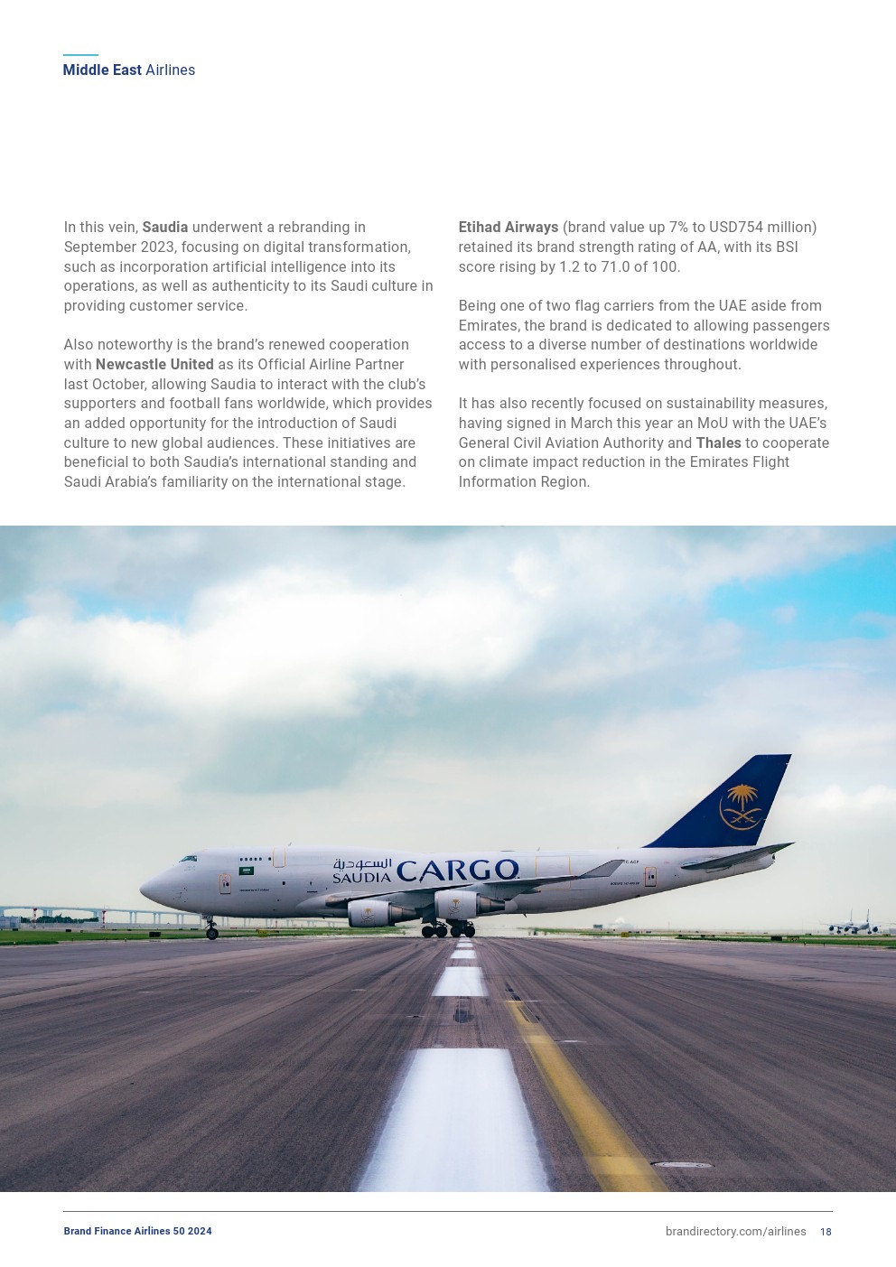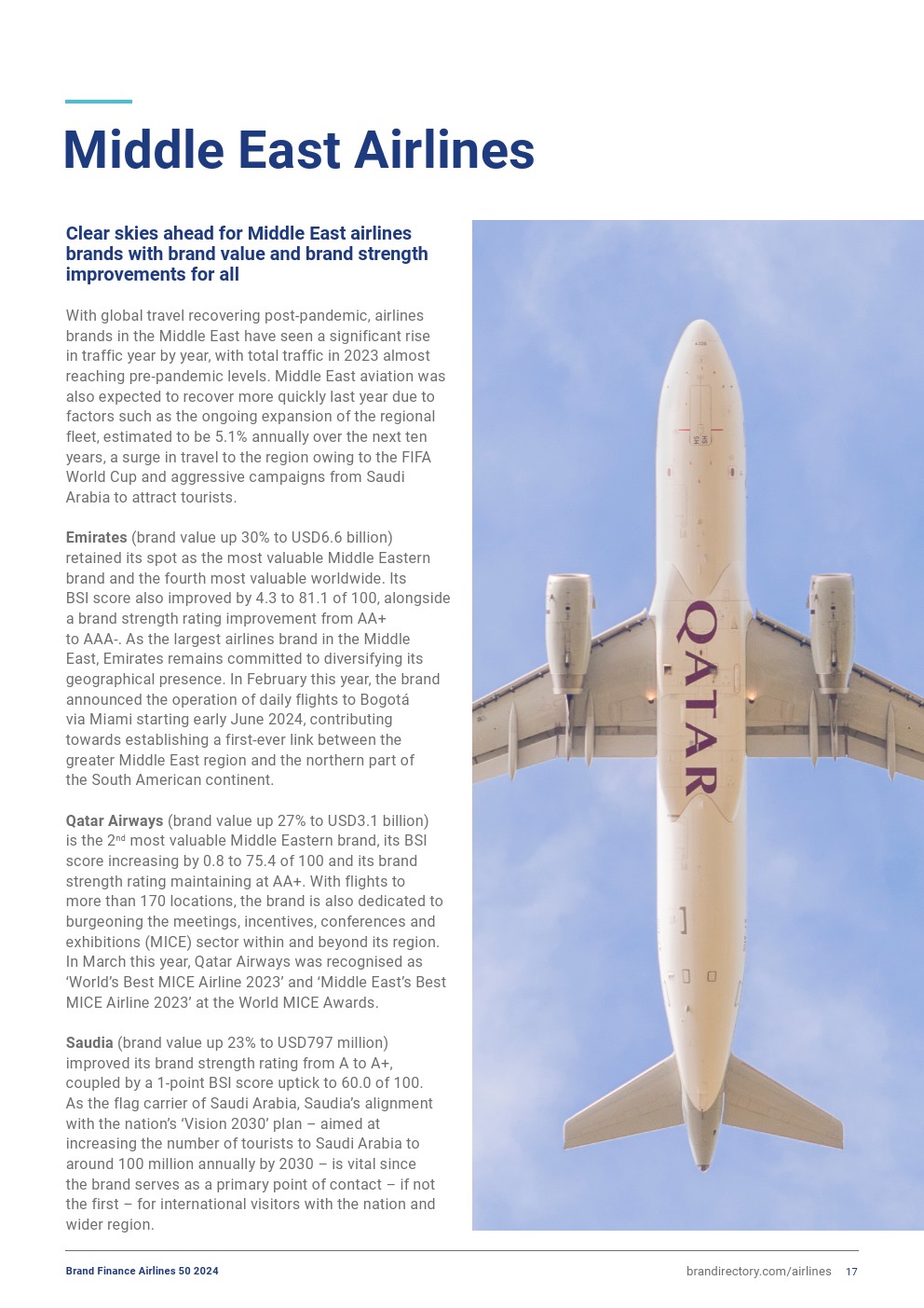 中东航空公司品牌价值和品牌实力全面提升;阿联酋航空领先,卡塔尔、沙特阿拉伯和阿提哈德航空的势头也在增强