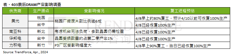 根据TrendForce集邦咨询于403震后对DRAM产业影响的最新调查,各供货商所需检修及报废晶圆数量不一,且厂房设备本身抗震能力均能达到一定的抗震效果,因此整体冲击较小。美光、南亚科、力积电、华邦电等,均大致恢复100%的产线运作,其中仅有美光已经转进至先进制程,多为1alpha与1beta nm,预估将影响整体DRAM产出位元占比;其余DRAM厂仍停留在38、25nm,产出占比相对小。整体而言,预期本次地震对第二季DRAM产出位元影响仍可控制在1%以内。